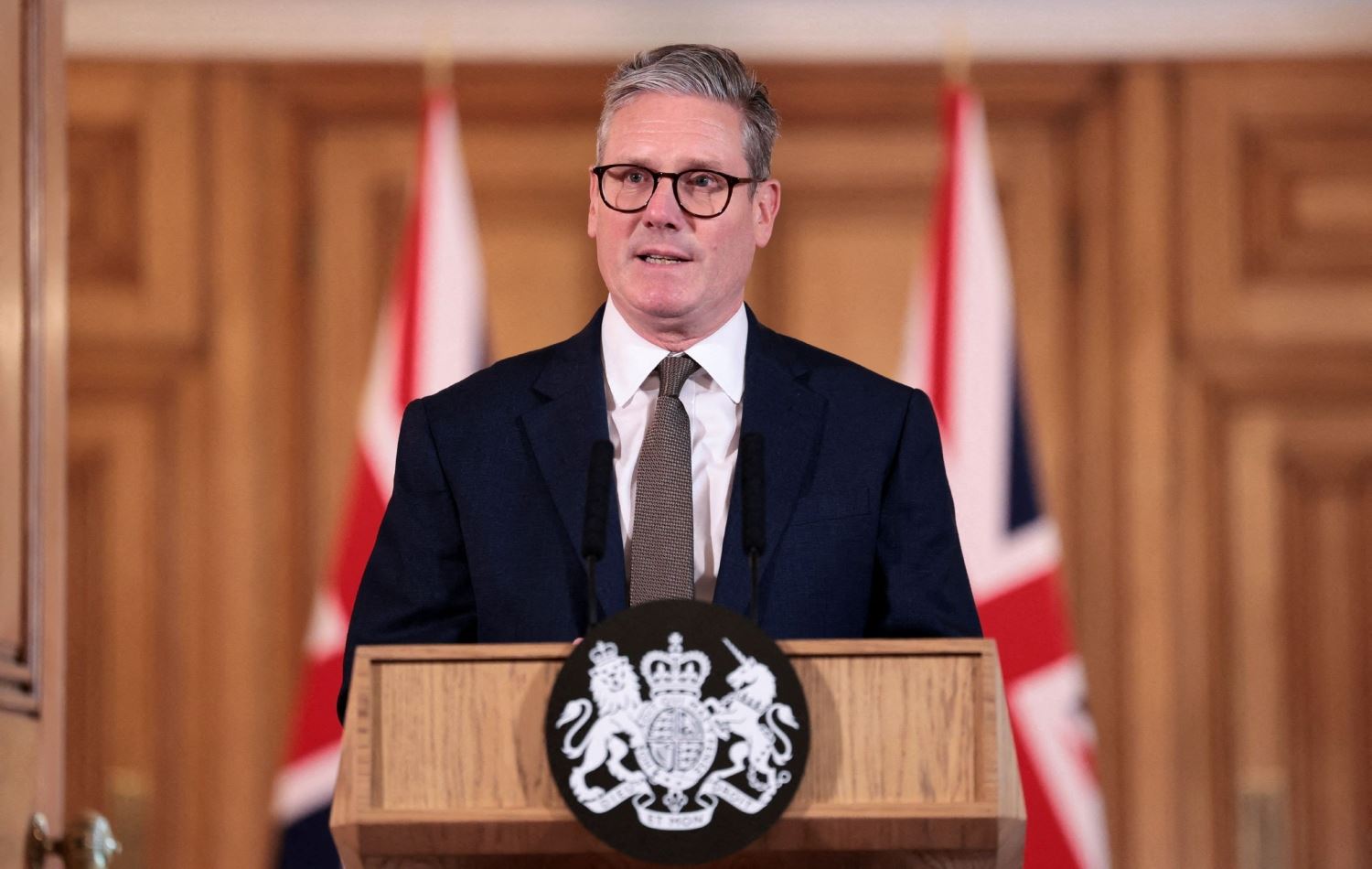 کیەر ستارمەر لە دوای یەکەم کۆبوونەوەی کابینەکەی، لە کۆنگرەیەکی رۆژنامەڤانیدا لە 6ـی حوزەیرانی 2024 قسە بۆ رۆژنامەڤانان دەکات، وێنە: Claudia Greco / POOL / AFP