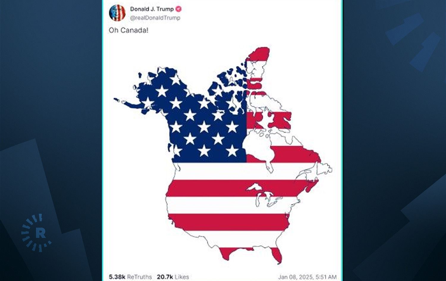 ئەمڕۆ (چوارشەممە، 8ـی کانوونی دووەمی 2025) دۆناڵد ترەمپ، سەرۆکی هەڵبژێردراوی ئەمریکا لە تۆڕە کۆمەڵایەتییەکەی بەناوی سۆشیاڵ تروس، نەخشەیەکی نوێی ئەمریکای بڵاوکردووەتەوە، لەو نەخشەیەدا، ترەمپ، کەنەدای دراوسێی وڵاتەکەی بە 51ـەمین ویلایەتی ئەمریکا داناوە و لەسەر نەخشەکەش نووسیوویەتی "ئای کەنەدا!"