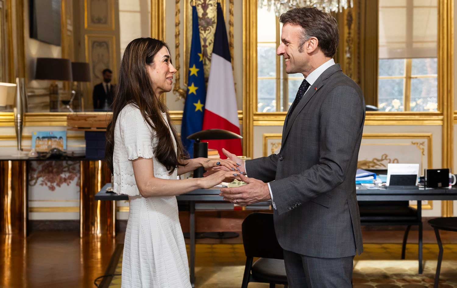 ئیمانوێل ماکرۆن، سەرۆککۆماری فەرەنسا لە کۆشکی ئیلیزێ پێشوازی لە نادیە موراد، کچە کوردی ئێزدیی براوەی خەڵاتی نۆبڵی ئاشتی کرد.