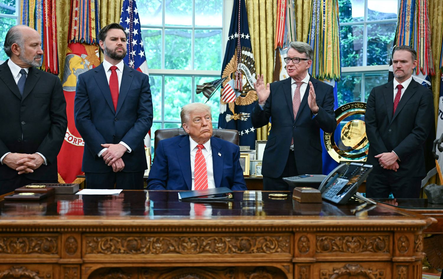ترەمپ بە ئامادەبوونی پیتەر ماندێڵسن، باڵیۆزی بەریتانیا لە ئەمریکا رێککەوتنەکەی واژۆکرد. وێنە: AFP