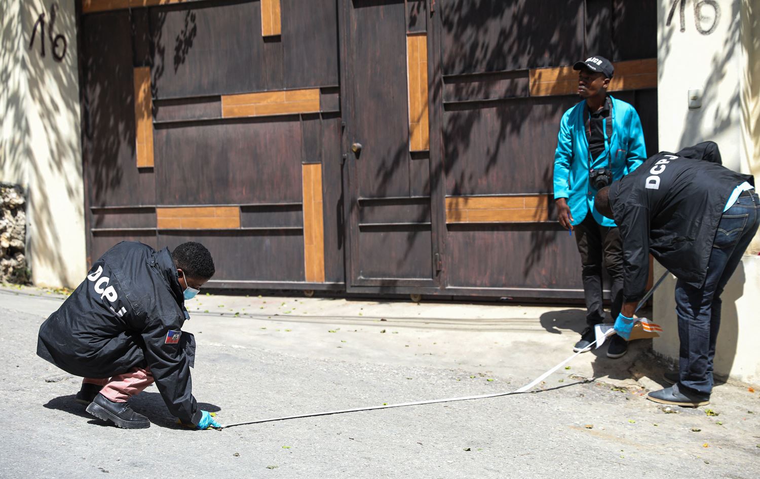 چەند پۆلیسێکی هایتی لێکۆڵینەوە لە چۆنییەتی کوژرانی سەرۆکی وڵاتەکە دەکەن. وێنە؛ AFP / VALERIE BAERISWYL