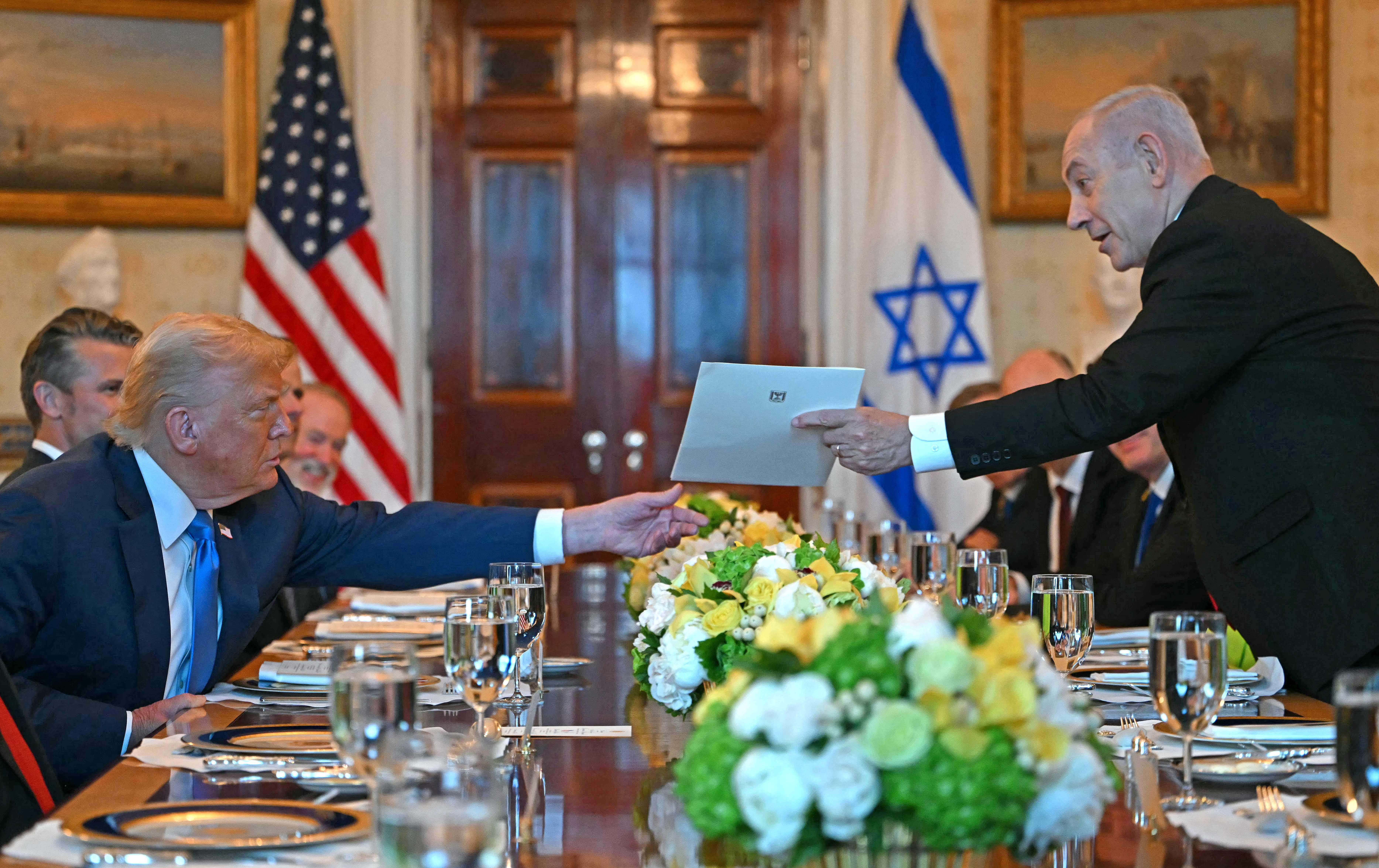 ئەو ساتەی نەتەنیاهوو، نامەی پێشنیازی بەربژێرکردنی ترەمپی بۆ خەڵاتی نۆبڵی ئاشتی دایە دەستی. وێنە: AFP