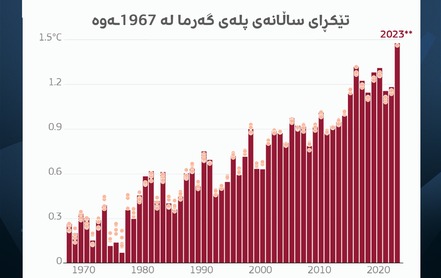 بەپێی لێکدانەوەی ئەو ئاژانسە بێت، کە ئەمڕۆ سێشەممە بڵاویکردەوە، لە 173 ساڵی رابردوودا (1850 - 2023) هیچ ساڵێک نەبووە هێندەی 2023 تینی گەرما بەهێز بووبێت.