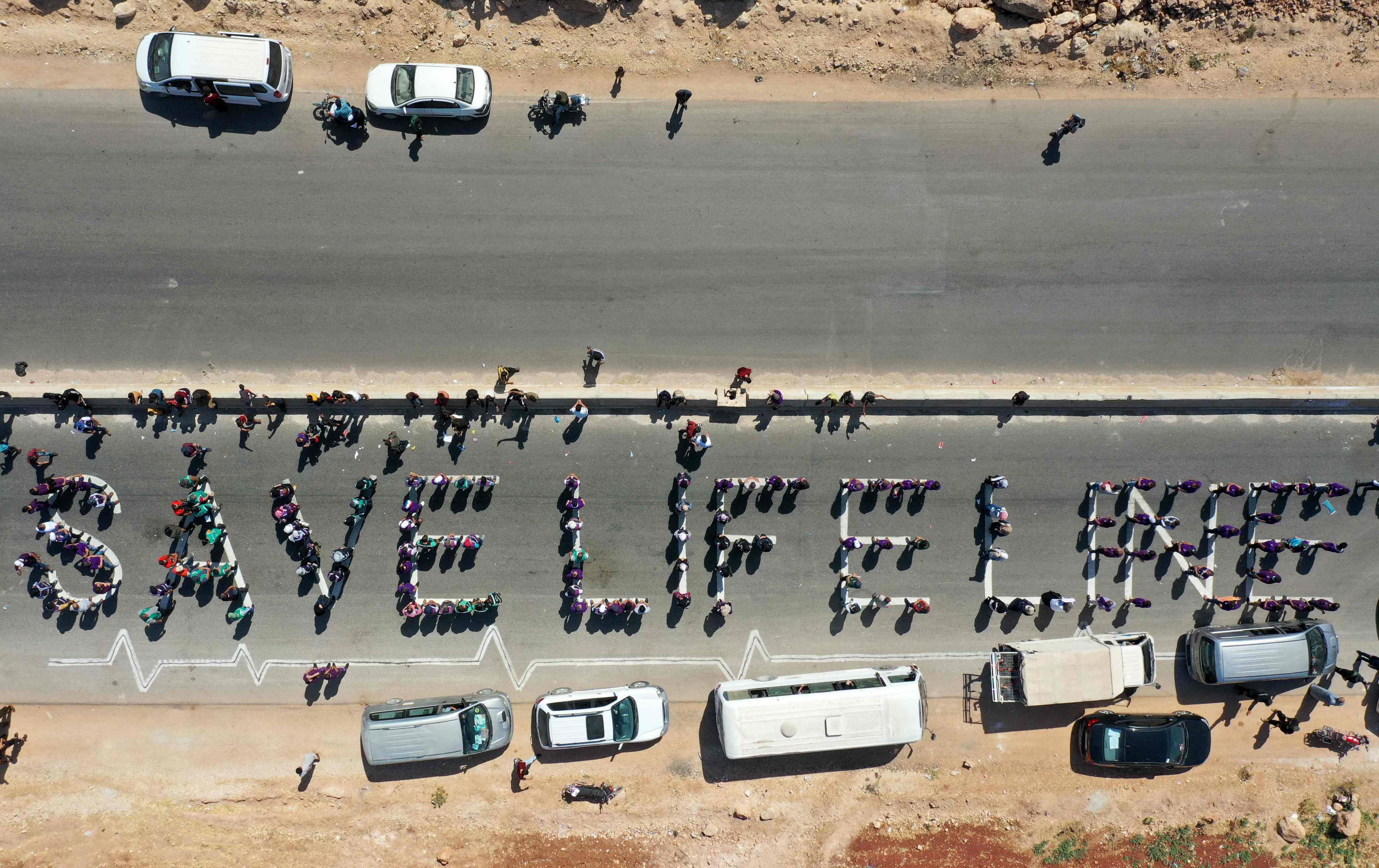 چالاکییەکی ژمارەیەک چالاکڤانی مەدەنی لە نزیک دەروازەی بابولهەوا کە داوا دەکەن دەروازەکە بە کراوەیی بمێنێتەوە. وێنە: AFP / Omar HAJ KADOUR