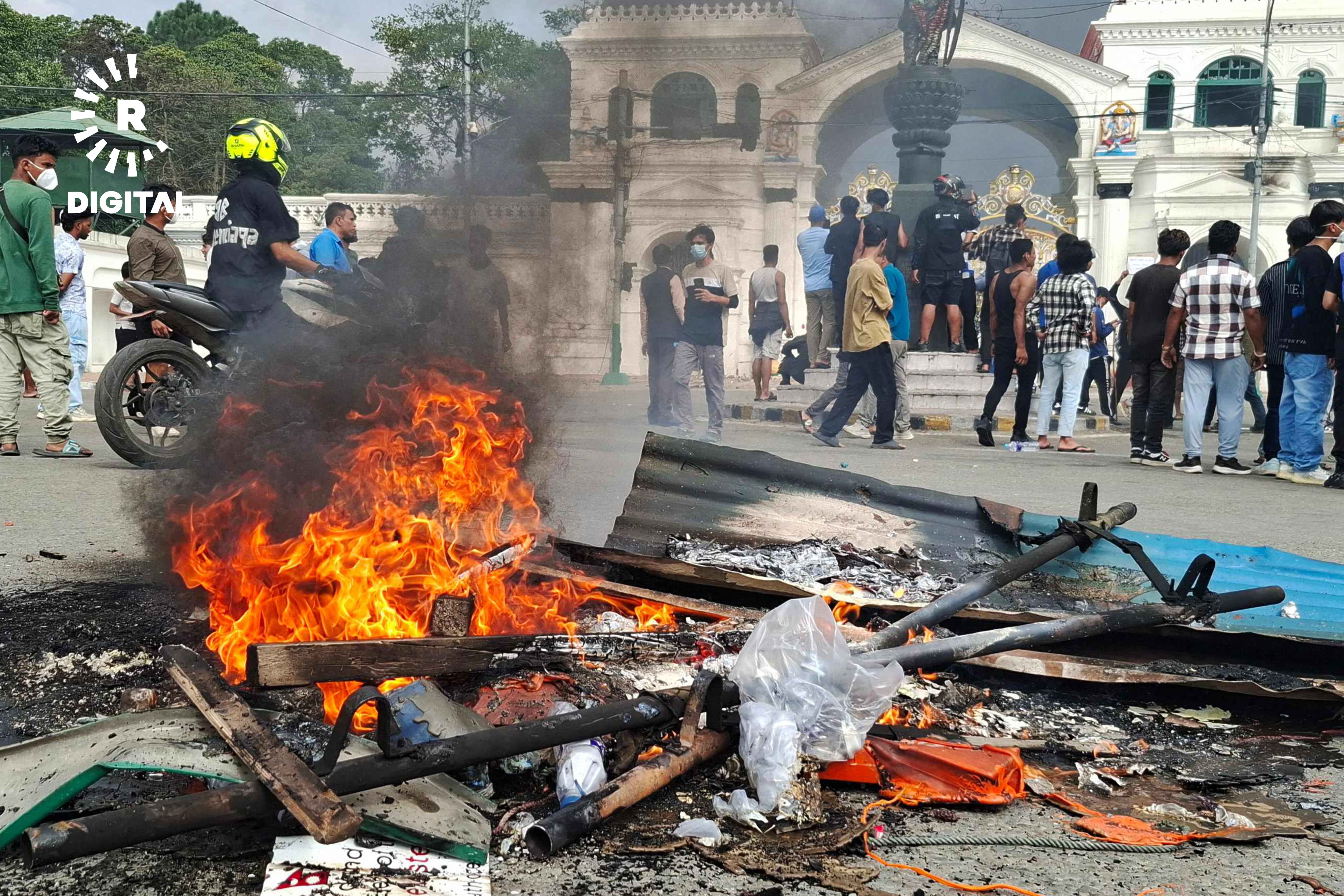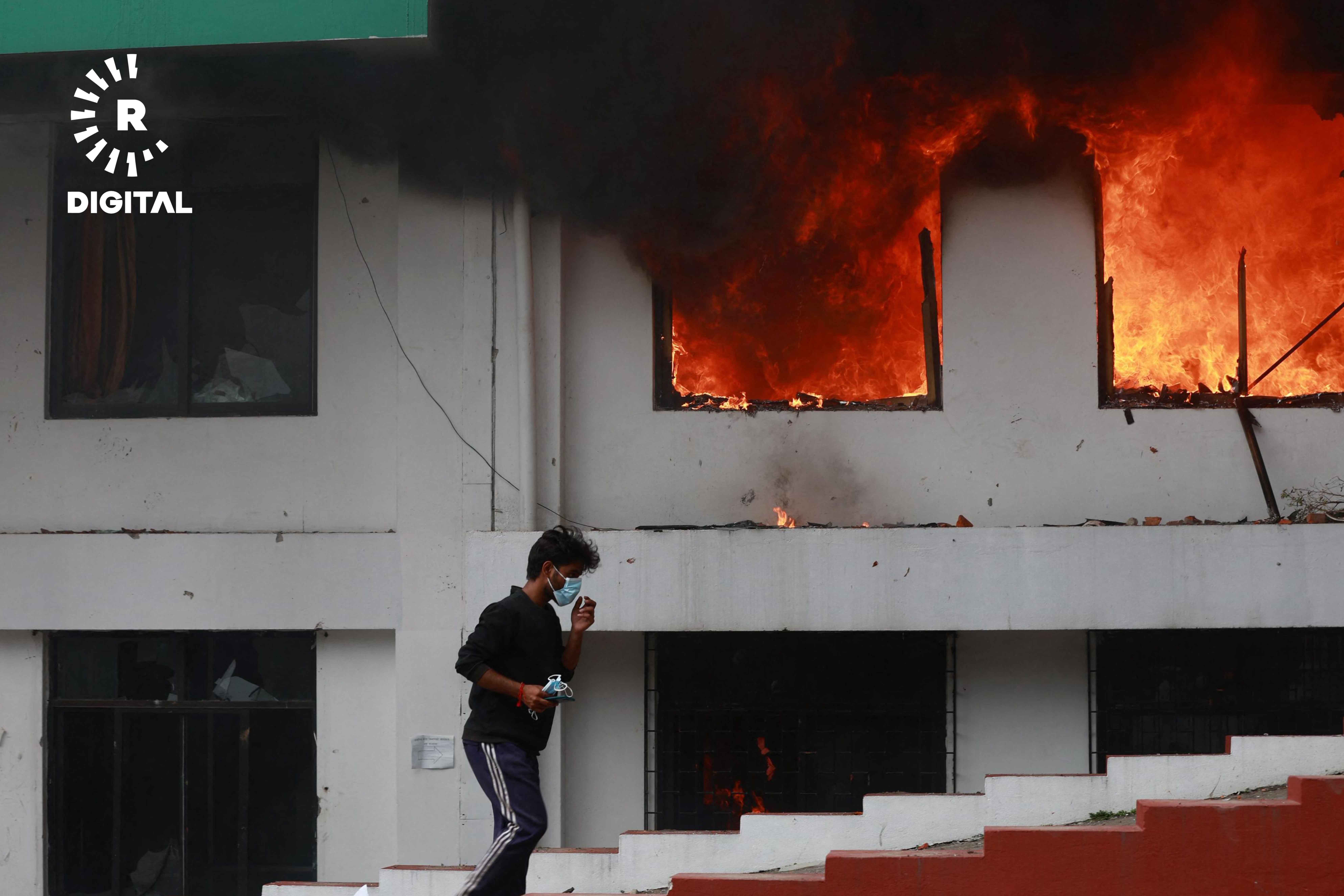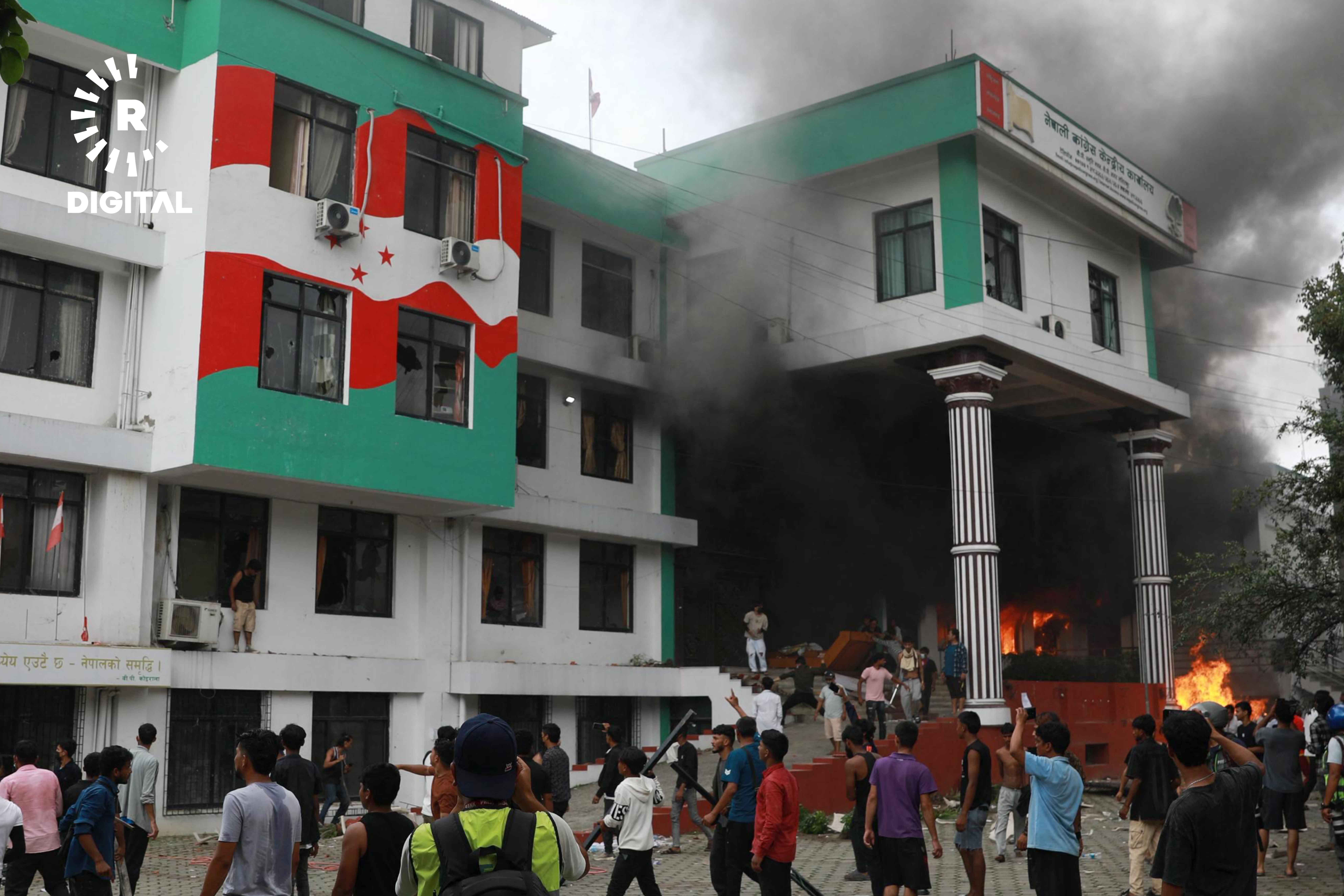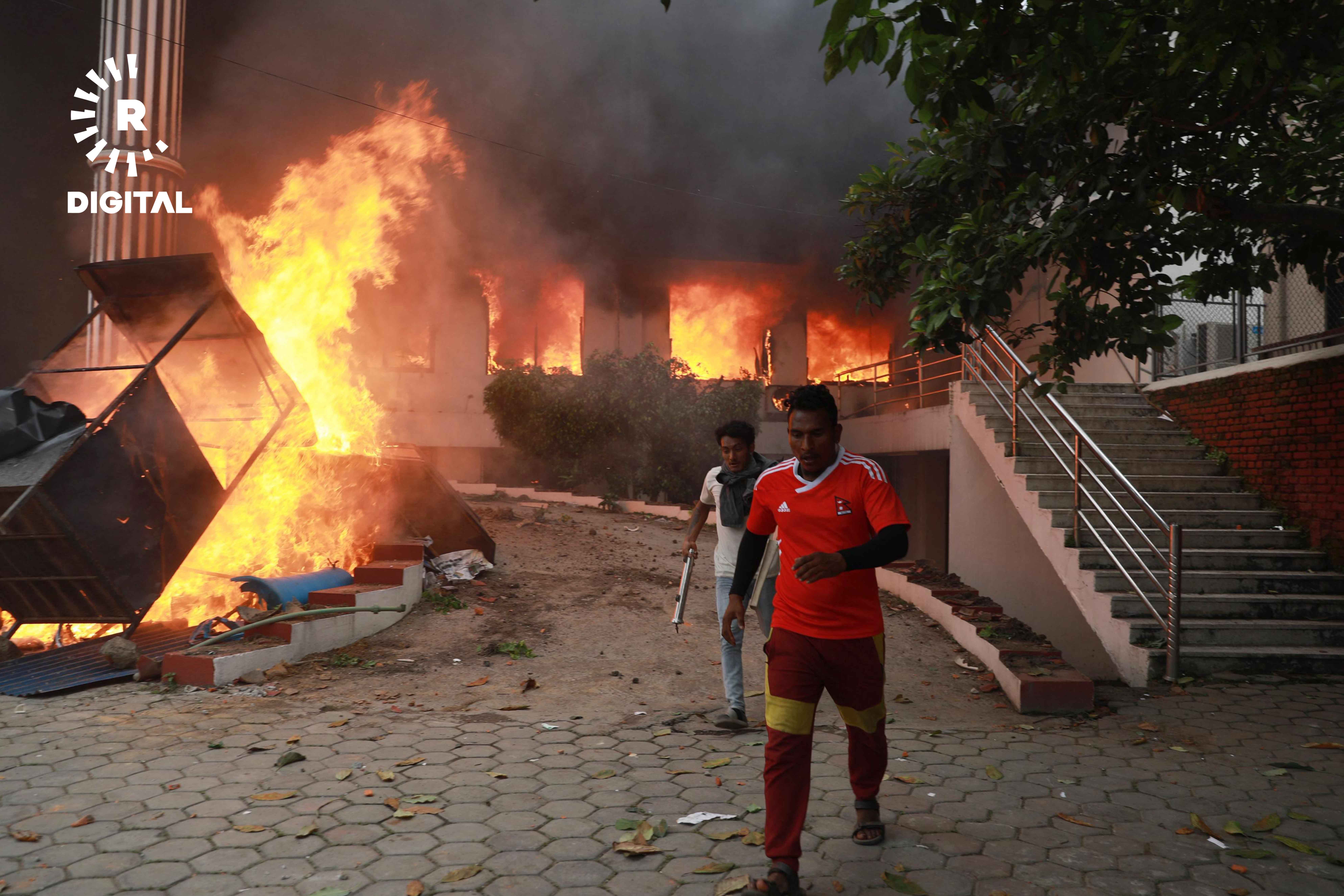 دواتر خۆپێشاندەران ئاگریان لە باڵەخانەی پەرلەمان بەردا. ئیکرام گیری، گوتەبێژێکی حکومەتی نیپاڵ بە ئاژانسی فرانس پرێسی راگەیاند، "سەدان کەس هەڵیانکوتایە سەر پەرلەمان و ئاگریان لە باڵەخانە سەرەکییەکە بەردا."
