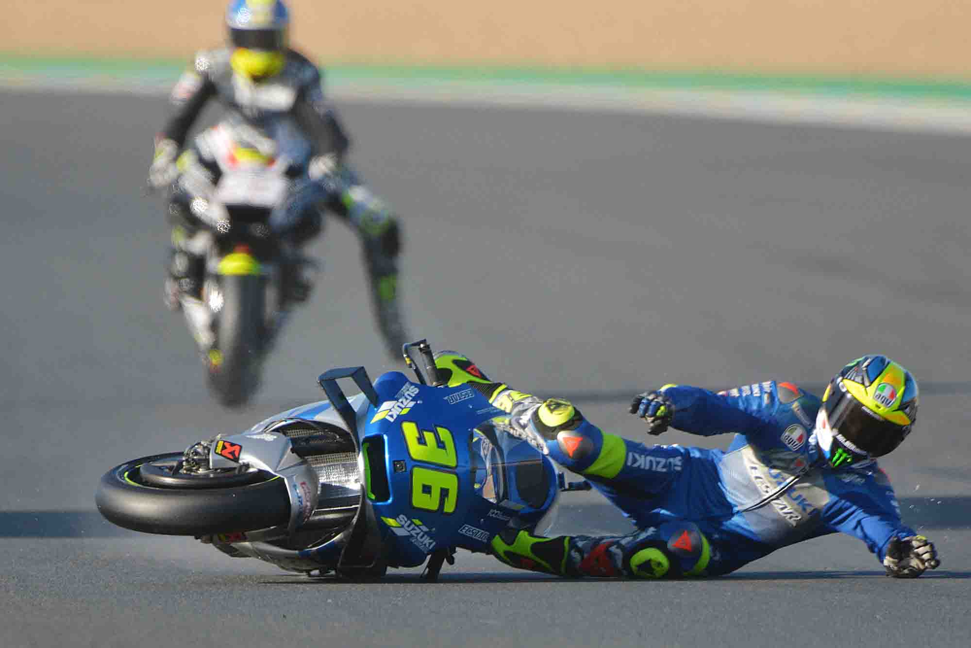 خوان میر، شوفێری ماتۆڕی سوزوکی لەکاتی کەوتنی لەسەر ماتۆڕەکەی لە سێیەمین وەرزی خولی مۆتۆ جیپی کە لە فەرەنسا بەڕێوەدەچێت./AFP
