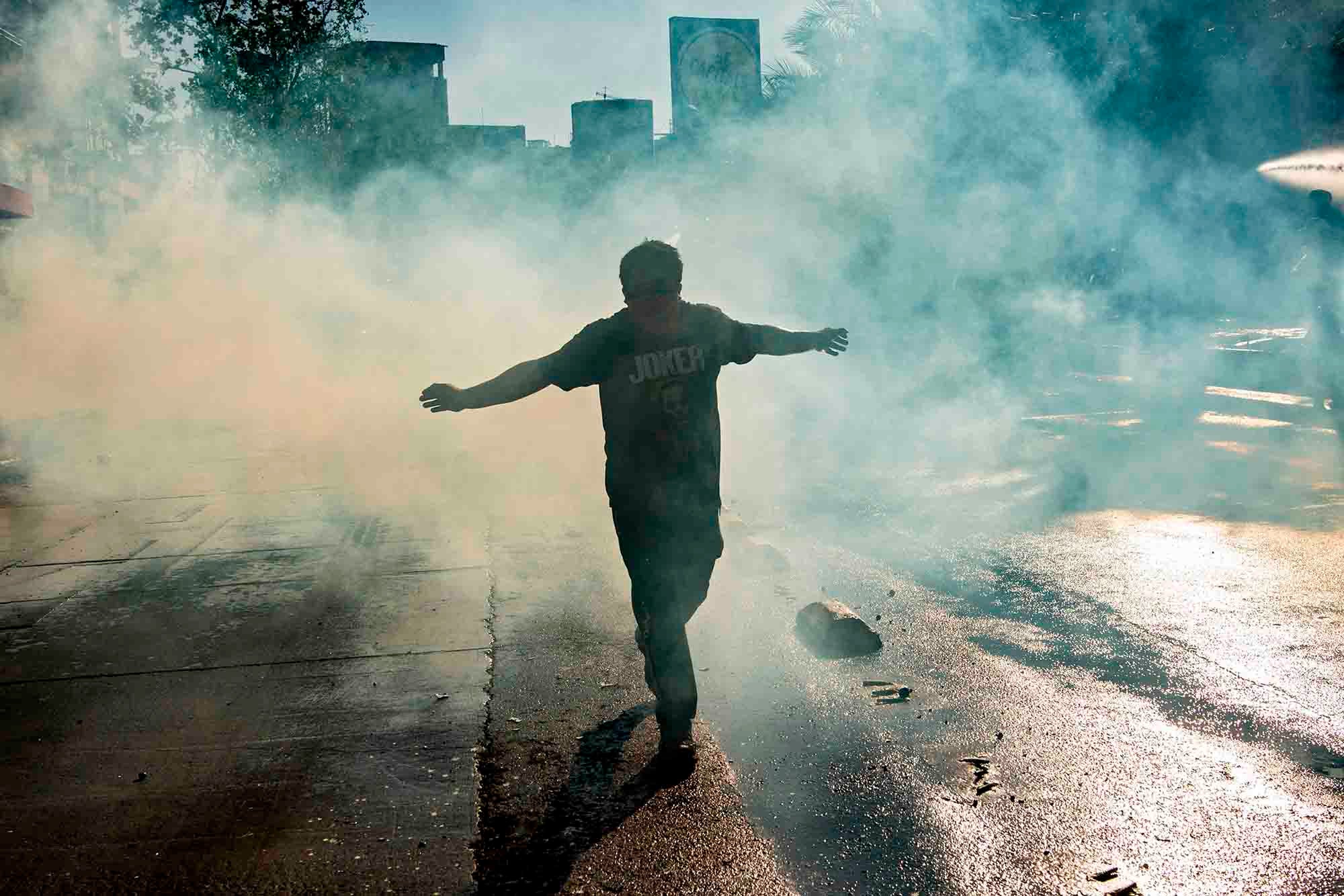 خۆپێشاندەرێک رووبەڕووی پۆلیس دەبێتەوە لە کاتی خۆپێشاندانێکی دژ بە سبستیان پینێرای سەرۆکی شیلی./AFP