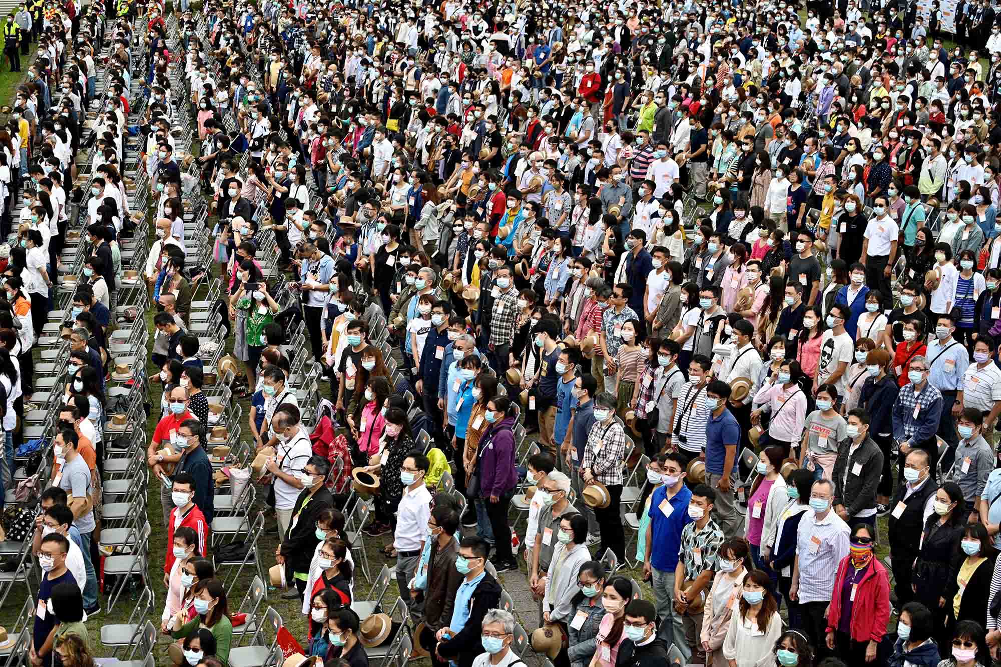 کۆمەڵێک کەسی دەمامکدار لەبەردەم نووسینگەی سەرۆکایەتی لە تایپیی پایتەختی تایوان، 10ی ئۆکتۆبەری 2020./AFP