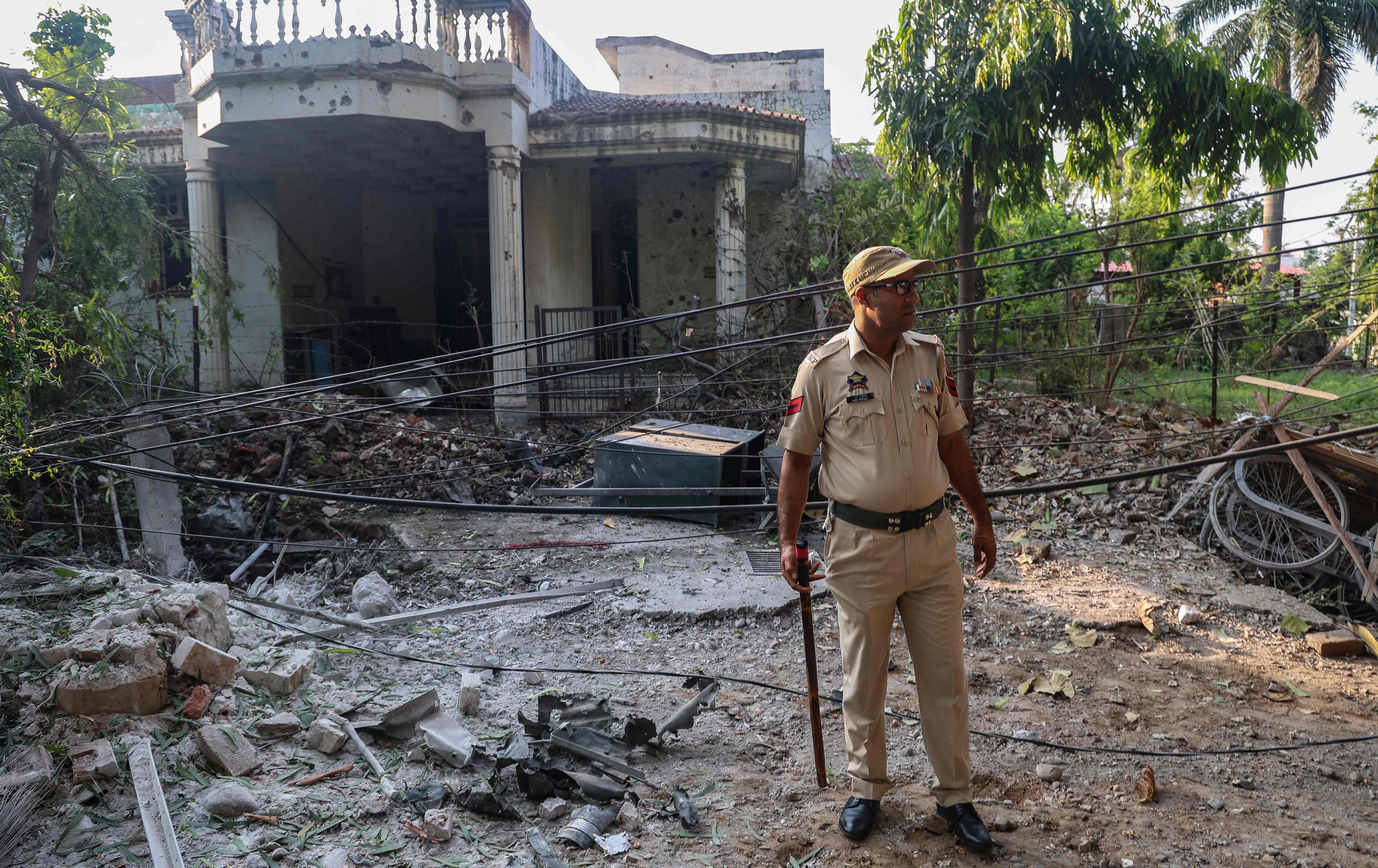 پۆلیسێکی هیندی لە بەردەم خانوویەک وەستاوە کە بە هۆی تۆپبارانی پاکستانەوە زیانی پێگەیشتووە. وێنە: Rakesh BAKSHI / AFP