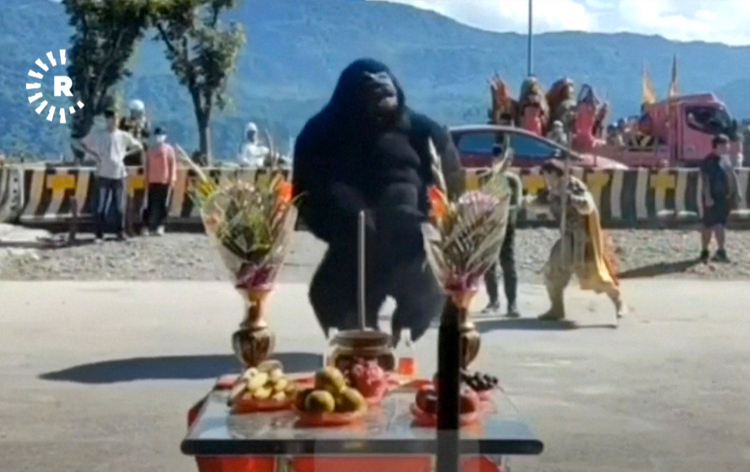 ئەو کەسەی بەرگی گۆرێلای پۆشیوە، لەکاتی سەردانی خەڵکەکەدا بۆ پەرستگەکە، سەمایەکی سەرنجڕاکێش دەکات و دواتریش وەکو ئاماژەیەک بۆ پیشاندانی رێز بۆیان، سەر دادەنەوێنێت.