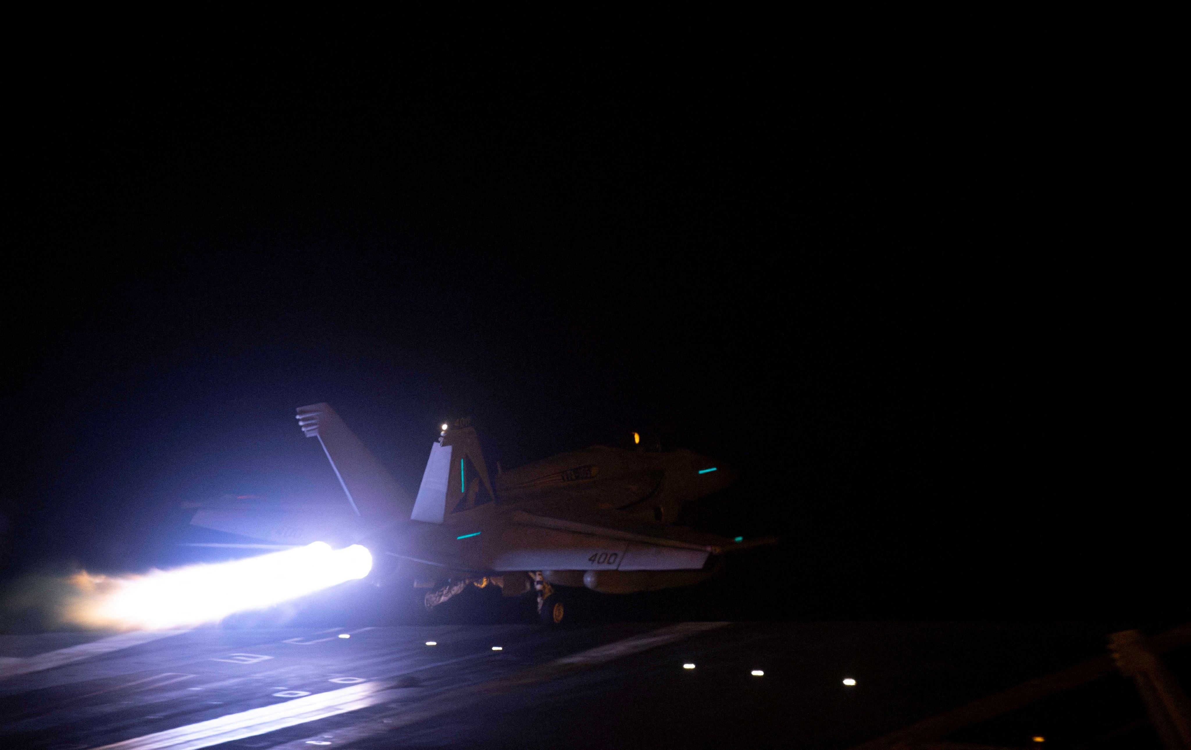 فڕۆکەیەکی جەنگیی ئەمریکی بەرەو بۆردوومانی حووسییەکانی یەمەن هەڵدەفڕێت، رۆژی 12-1-2024. وێنە: US Central Command