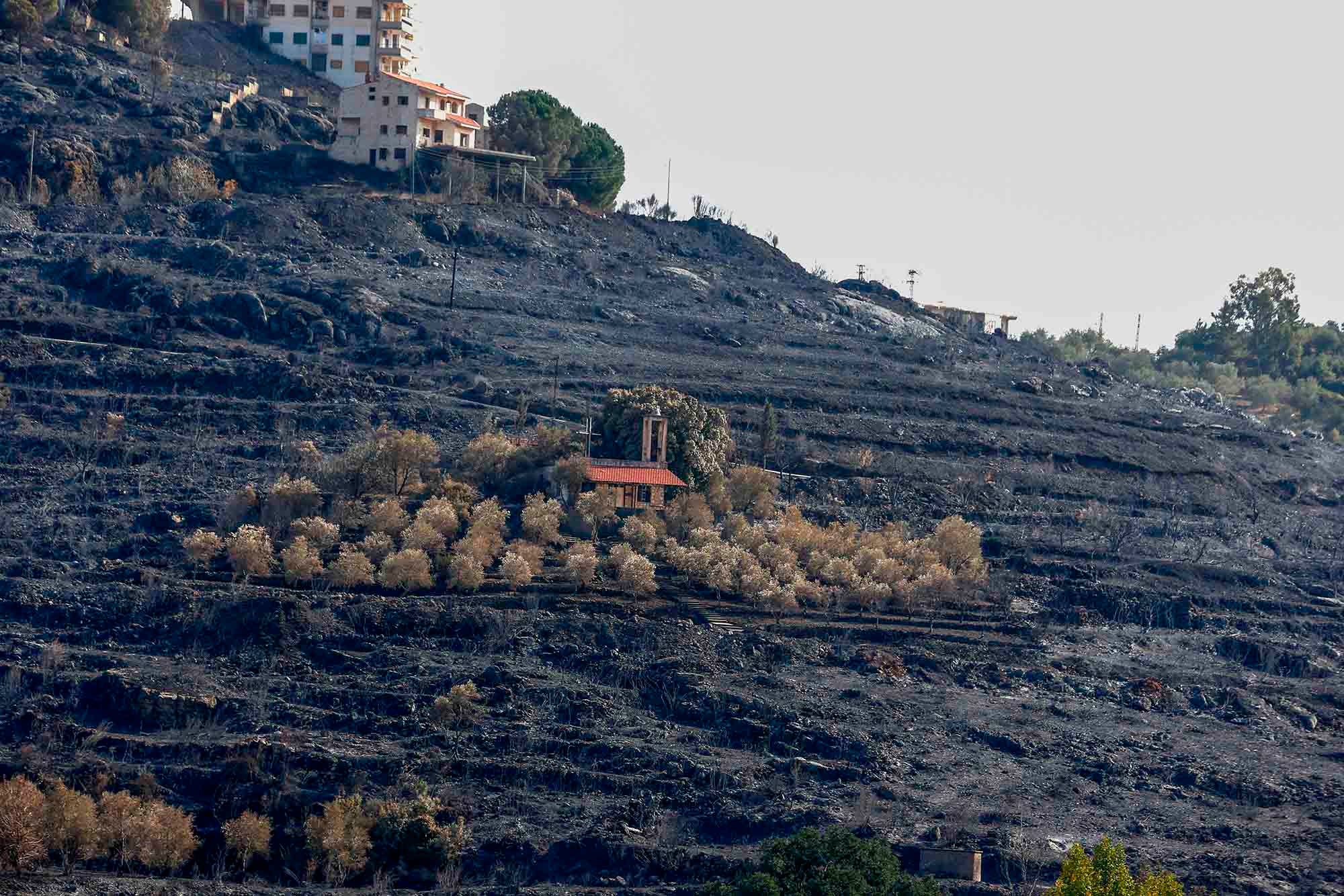 کەنیسەیەک لە قەدپاڵی گردێکی سووتاوی شاری تەرتووس لە سووریا. /AFP