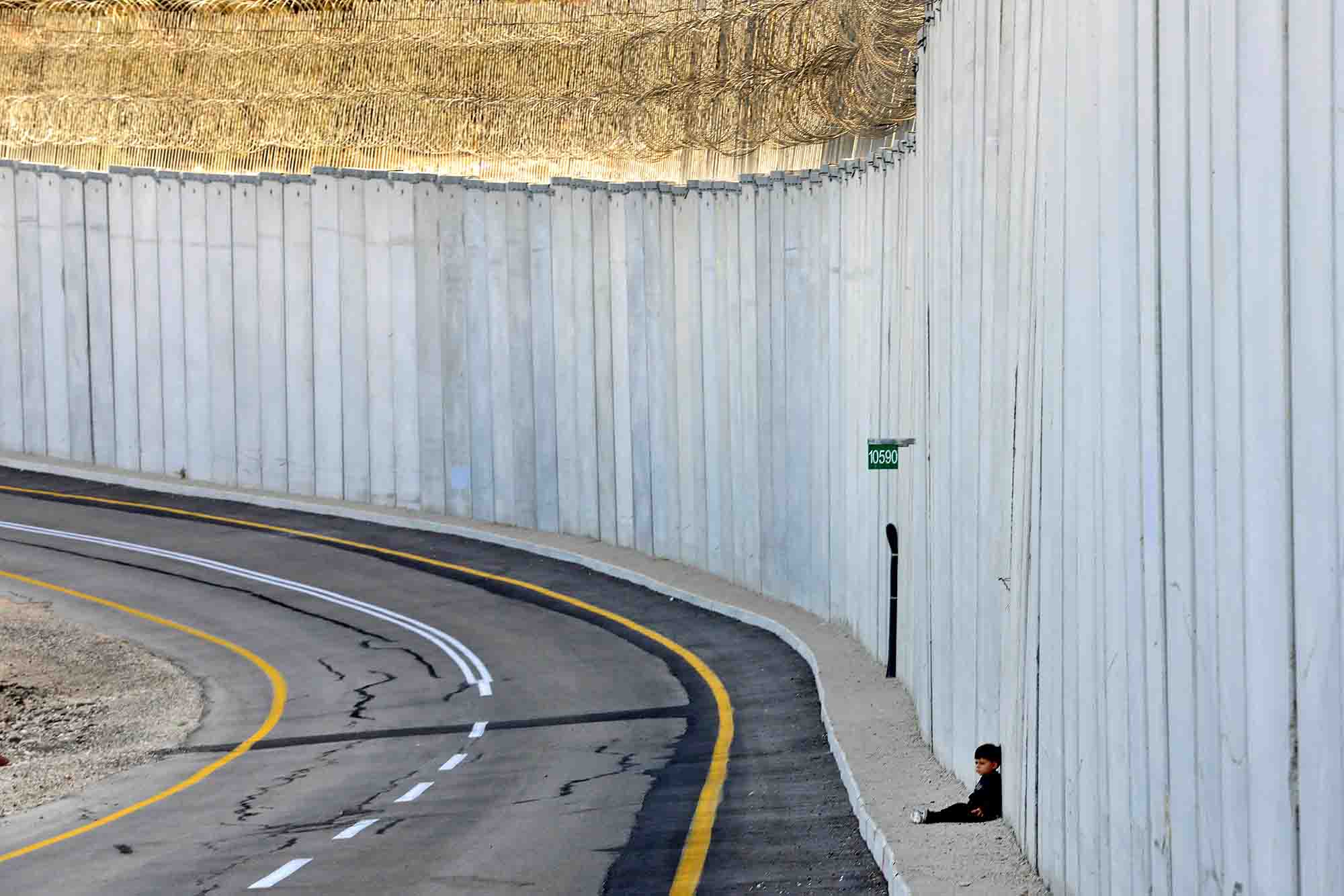 منداڵێکی فەڵەستینی پاڵیداوە بە دیوارێکی ئەمنیی ئیسرائیلەوە لەکاتێکدا دایک و باوکی لە گوندێکی سەر بە کەناری رۆژئاوا خەریکی لێکردنەوەی زەیتوونن./ AFP