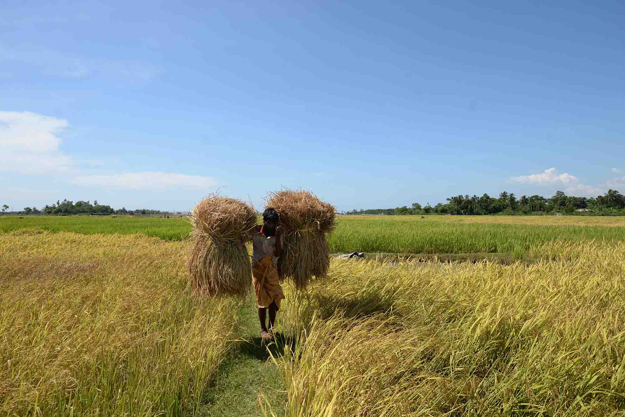 پیاوێک لە ناوچەیەکی بەنگلادیش دوو گورزە پووش و پەڵاشی هەڵگرتووە و دەیگوازێتەوە. /AFP