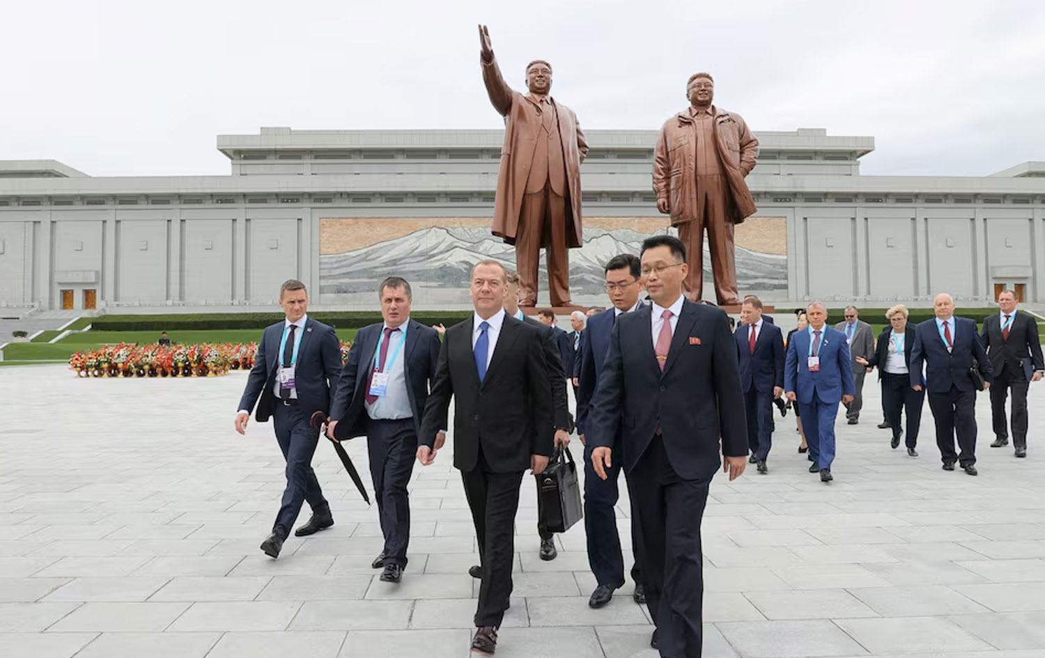 دمیتری مێدڤێدێڤ، جێگری سەرۆکی ئەنجوومەنی ئاسایشی نیشتمانیی رووسیا لەگەڵ ژمارەیەک سەرکردەی دیکەی بیانی، بەشدارییان لە نمایشێکی سەربازیی گەورە لە پیۆنگیانگ کرد، کە بەبۆنەی 80یەمین ساڵیادی دامەزراندنی پارتی کرێکارانی دەسەڵاتدارەوە رێکخرابوو.