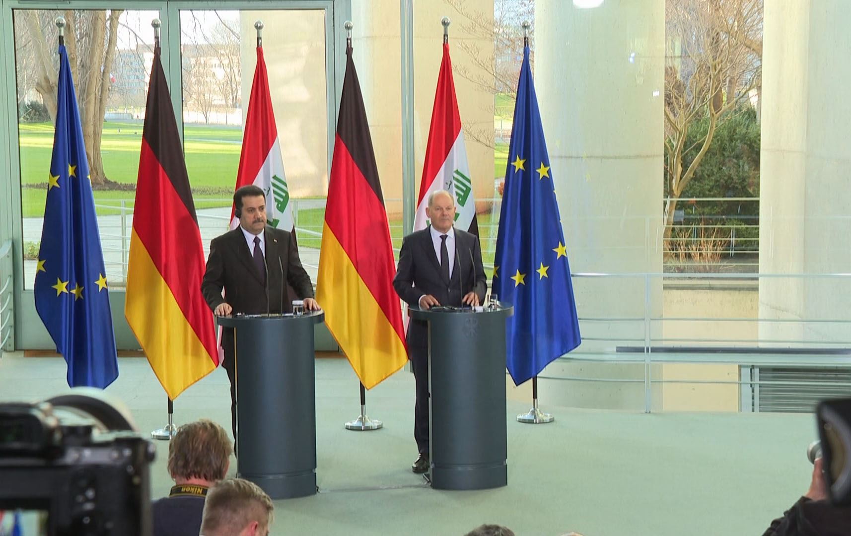 راوێژکاری ئەڵمانیا بە رێورەسمێکی سەربازی پێشوازی لە سەرۆکوەزیرانی عێراق کرد. لە کۆبوونەوەی نێوان محەممەد شیاع سوودانی و شۆڵتز، سی تەوەری گرنگ باس کران کە ئەوانیش ئابووری، وزە و پرسی کۆچبەران بوون.