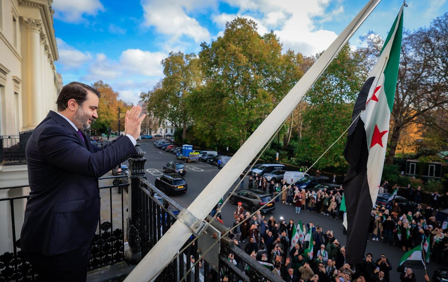 ئاڵای سووریا جارێکی دیکە لەسەر باڵەخانەی باڵیۆزخانەی ئەو وڵاتە لە لەندەن هەڵکرایەوە، کە یەکەمجارە لەدوای داخستنی لە ساڵی 2011ـەوە باڵیۆزخانەکە بکرێتەوە.