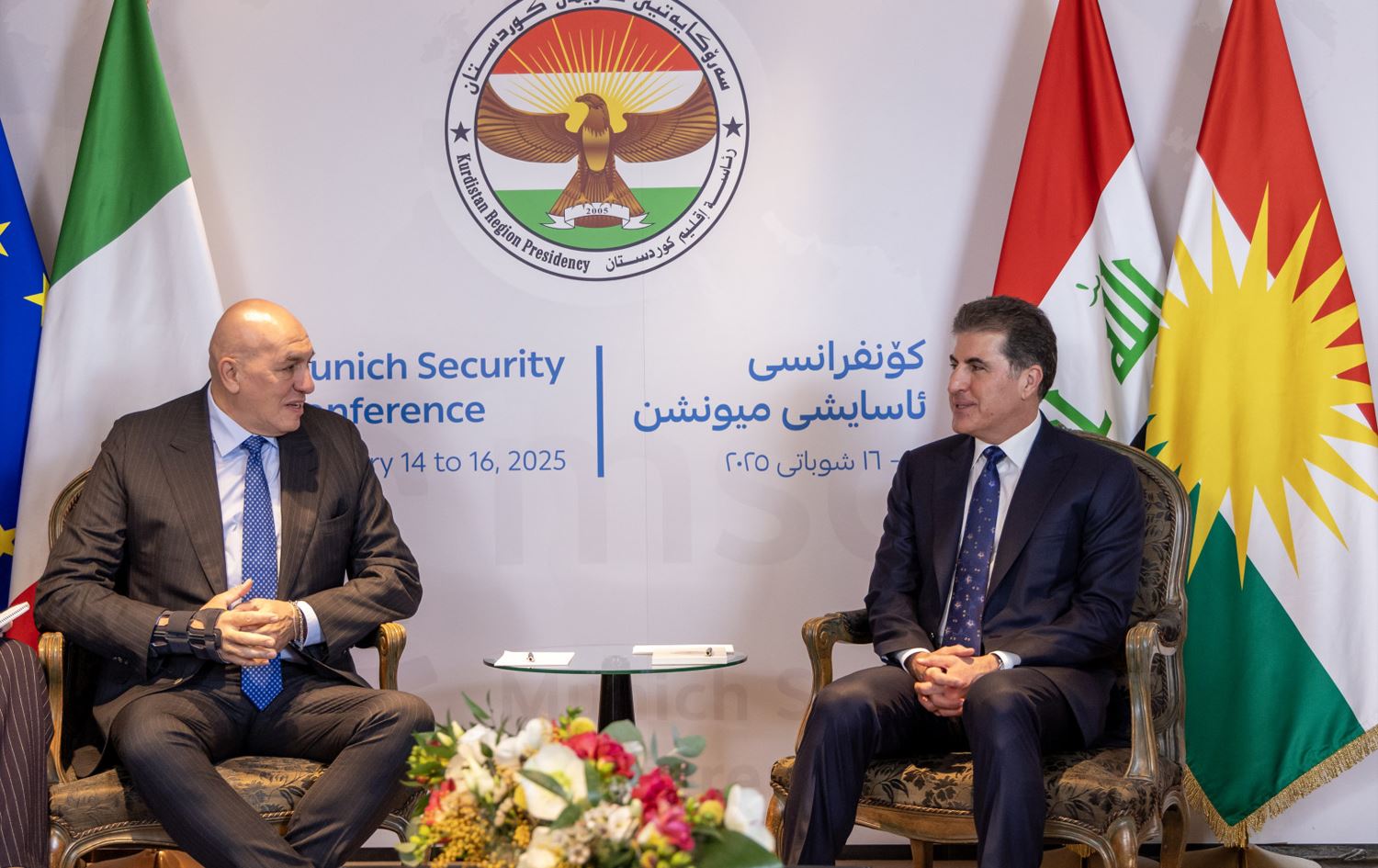 له کاتی بهشداريكردنى له کۆنفرانسی ئاسایشی میونشندا، ئهمڕۆ ههينى، 14ـی شوباتی 2025، نێچيرڤان بارزانى، سەرۆکی هەرێمی کوردستان لهگهڵ گويدۆ كرۆسێتۆ، وهزيرى بهرگريى ئيتاڵيا کۆبووەوە.