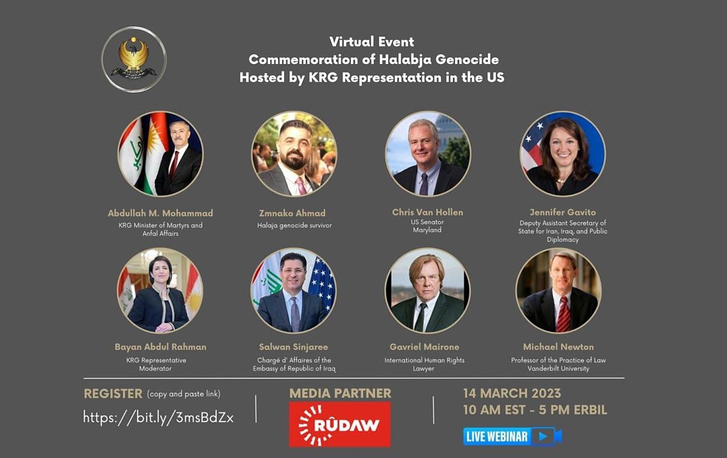 وێبینارە ئۆنلاینەکە، لەژێر ناونیشانی "دادپەروەری و لێپرسینەوە بۆ جینۆساید، 20 ساڵ لەدوای ئازادکردنی عێراق" کاژێر 10:00ـی بەیانی بە کاتی ئەمریکا (05:00ـی ئێوارە بە کاتی هەولێر) دەستپێدەکات و تۆڕی میدیایی رووداو سپۆنسەری میدیایی وێبینارەکەیە.