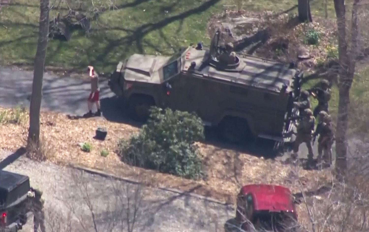 چەند دیمەنێک لە میدیای ئەمریکی بڵاوکرانەوە کە تێیدا دەردەکەوێت لە شارۆچکەی نۆرس دایتنی ویلایەتی ماساچوسێتس گومانلێکراوەکە بە شۆرتێکی سوور و تیشێرتێکەوە لە ماڵەکەی دێتە دەرەوە و خۆی بەدەستەوە دەدات و دواتر لەلایەن دوو سەربازی FBIیەوە کەلەپچە دەکرێت.