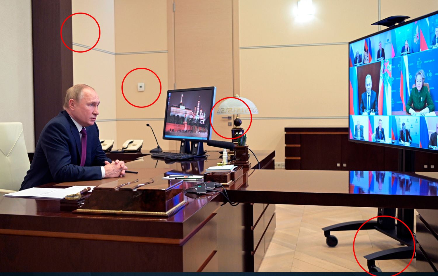 بەپێی لێکۆڵینەوەیەکی نوێی رۆژنامەڤانی، ڤلادیمیر پووتین، سەرۆکی رووسیا، ئۆفیسێکی هاوشێوەی لە سێ شوێنی دوور لەیەکدی هەیە و زۆر جار بۆ سەرلێشێواندنی وڵاتان بەکاریان دەهێنێت؛ بەڵام هەندێ وردەکاریی بچووک بوونەتە هۆی ئاشکراکردنی تەکنیکەکەی.