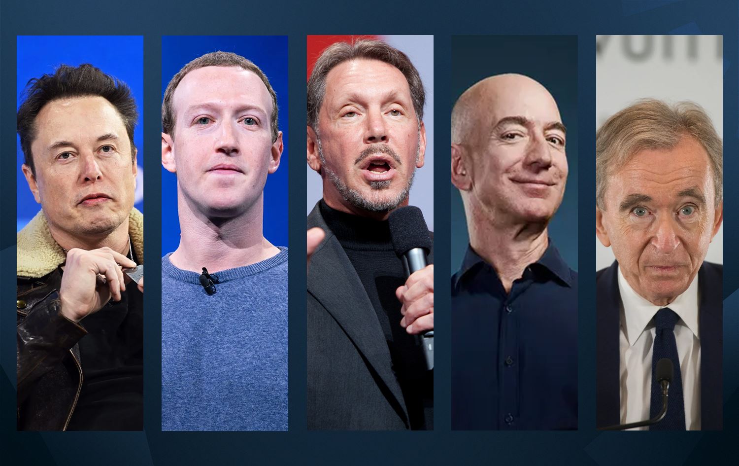 هەریەک لە ئێلۆن مەسک، بێرنارد ئارنۆڵت، جێف بیزۆس، لاری ئیلیسن و مارک زوکەربێرگ لە پێنج دەوڵەمەندترینەکانی جیهانن.