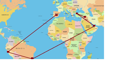 ئەو پەنابەرانە بەهۆی پاسپۆرتی ساختەوە لە توركیاوە دەچنە دوبەی، لەوێشەوە بە فڕۆكە دەچنە بەرازیل. دوای چەند رۆژ مانەوە لە شوقەیەكدا لەگەڵ چەند پەنابەرێكی دیكەی سووری، دووبارە سواری فڕۆكە دەبن بەرەو وڵاتی پیرۆ. لە كۆتاییدا فڕۆكەكەیان لە پایتەختی ئیسپانیا دەنیشێتەوە، بەڵام لەوێ لەلایەن پۆلیسەوە دەستبەسەر دەكرێن. ئەوان لەگەڵ چەند پەنابەرێكی سەر بە نەتەوەی جیاواز لە شوێنێكدا دەمێننەوە كە رووبەرەكەی 25 مەتر چوارگۆشەیە. لەوێ چاوەڕێی وەڵام دەكەن بۆ داواكردنی مافی پەنابەرێتی. ئەو وەڵامە لە دۆخی ئاساییدا سێ رۆژ دەخایەنێت.