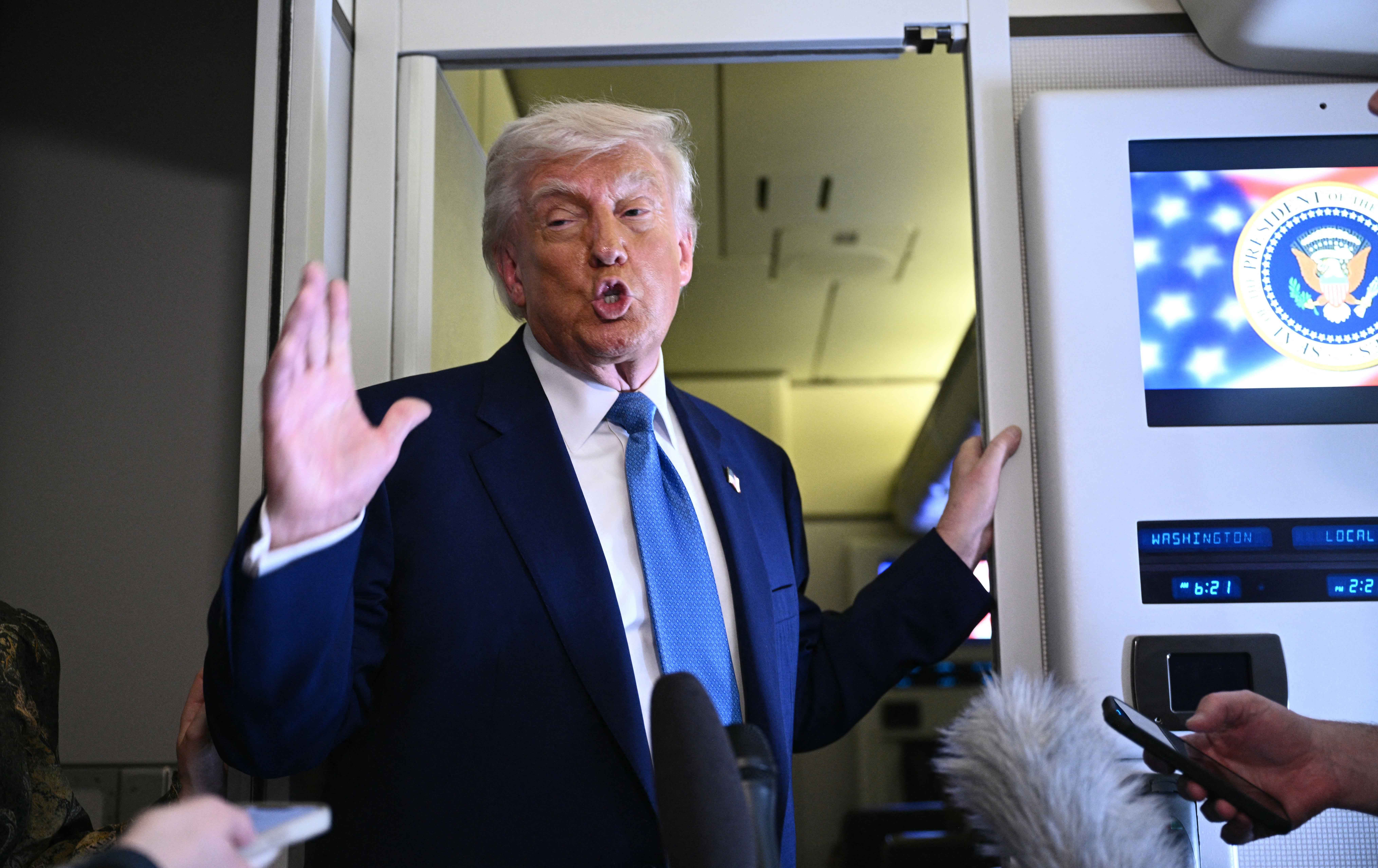 دۆناڵد ترەمپ، سەرۆکی ئەمریکا لەنێو فڕۆکەکەی قسە بۆ رۆژنامەڤانان دەکات لە ئەبوزەبی، 16-5-2025: AFP