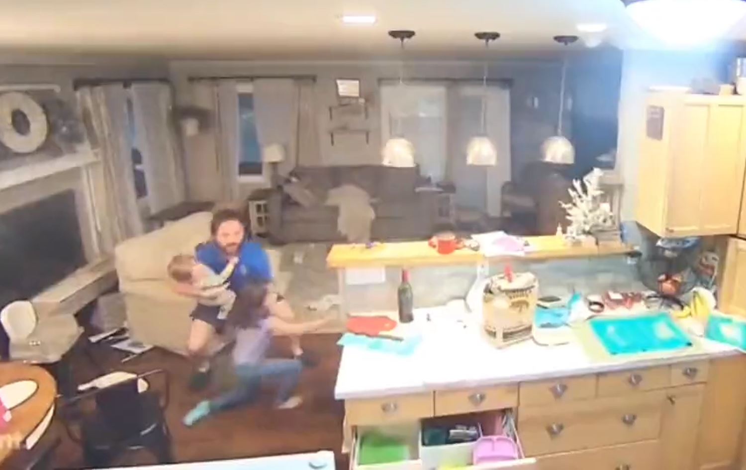 لەکاتی دروستبوونی بوومەلەرزەکەی ئالاسکا باوکێک منداڵەکانی دەکاتە باوەش و رادەکات. وێنە: لە ڤیدیۆیەکی تۆڕە کۆمەڵایەتییەکان وەرگیراوە