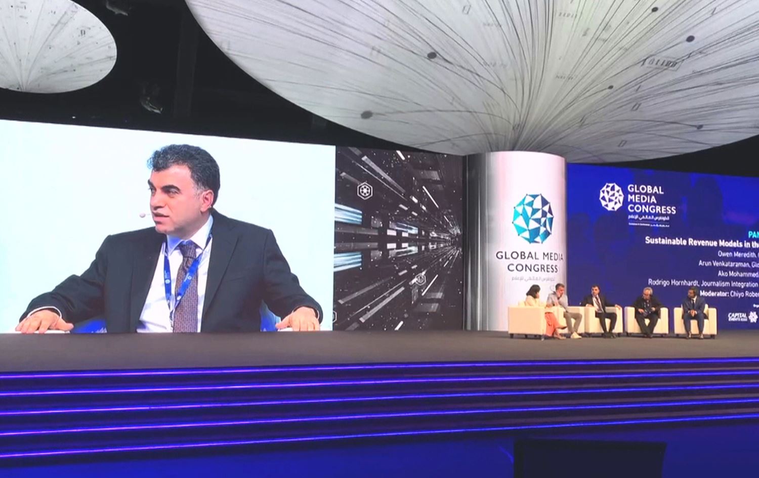 لەو پانێلەدا کە بە ناونیشانی "شێوازە خۆڕاگرەکانی داهات لە سەردەمی دیجیتاڵیدا؛ دیاریکردنی نەخشەڕێگەی قازانجکردن" بەڕێوەچوو، بەڕێوەبەری گشتیی تۆڕی میدیایی رووداو گوتی، "ئێمە لە سەردەمی چاپ و رۆژنامەی کاخەزدا رۆژنامەمان چاپ دەکرد و دەمانفرۆشت، بەڵام ئێستا چاپکردنی رۆژنامە راوەستاوە، چونکە لە عێراق هیچ رۆژنامەیەک نییە لە رۆژێکدا هەزار دانەی لێ بفرۆشرێت"؛ هەروەها ئاماژەی بەوە کرد کە لە عێراق "کولتووری هاوبەشیکردن لە پێدانی پارە بە کەناڵەکان نییە،" چونکە هیچ سیستمێک نییە بۆ پێدانی پارە لە لایەن وەرگرانەوە بە کەناڵەکان لە بەرامبەر خزمەتگوزارییەکانیان.