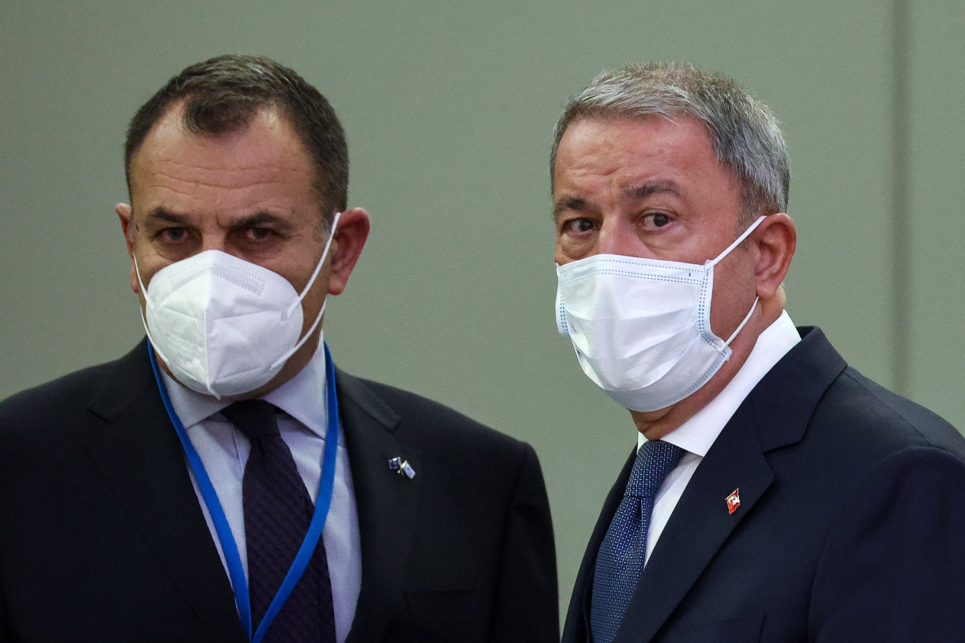 هەریەک لە خولوسی ئاکار، وەزیری بەرگریی تورکیا و نیکۆلاس پاناگیتۆپوڵس، وەزیری بەرگریی یۆنان لە بارەگای ناتۆ لە برۆکسل کۆبوونەوە.