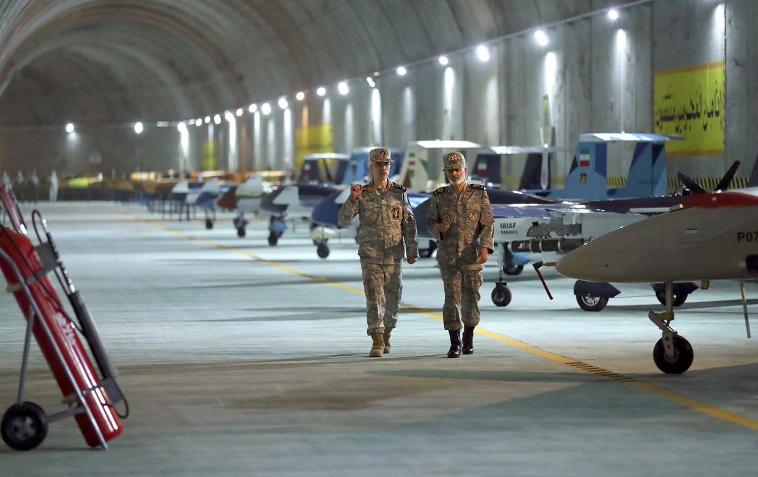 دوو بەرپرسی سەربازیی ئێران لەکاتی سەردانیان بۆ بنکەیەکی ژێرزەمینیی تایبەت بە درۆنەکانی ئێران. وێنە: سوپای ئێران