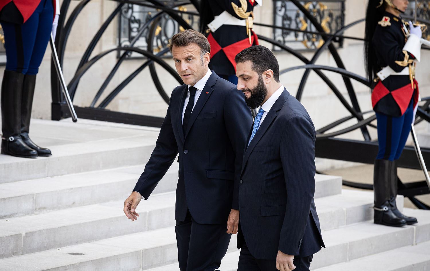 ئەحمەد شەرع، سەرۆککۆماری سووریا و ئیمانوێل ماکرۆن، سەرۆکی فەرەنسا. وێنە: Telmo Pinto/SOPA Images