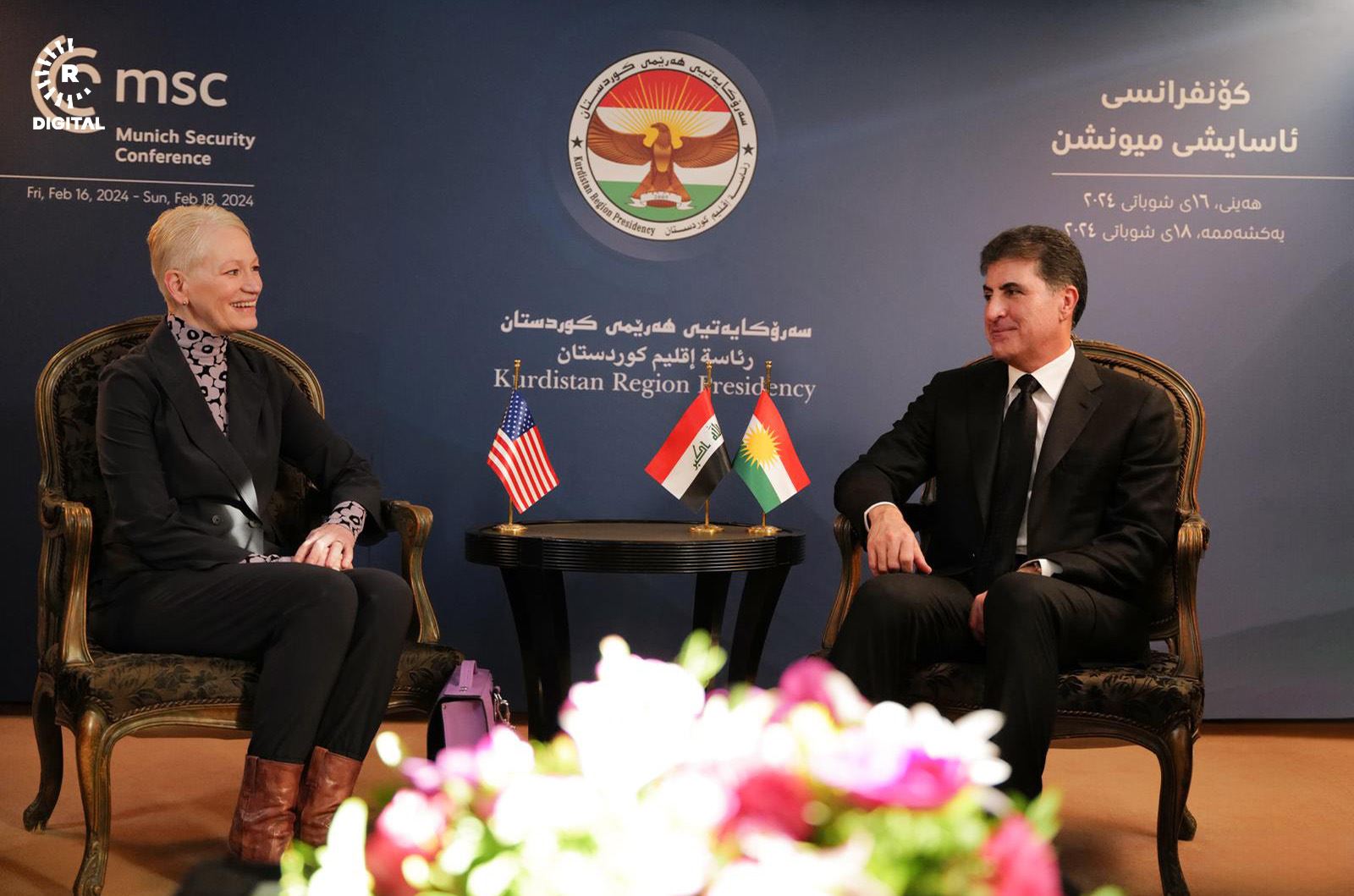دیمەنێکی کۆبوونەوەکەی سەرۆکی هەرێمی کوردستان و ياريدهدهرى وهزيرى بهرگريى ئهمریکا، 18-2-2024 لە میونشن