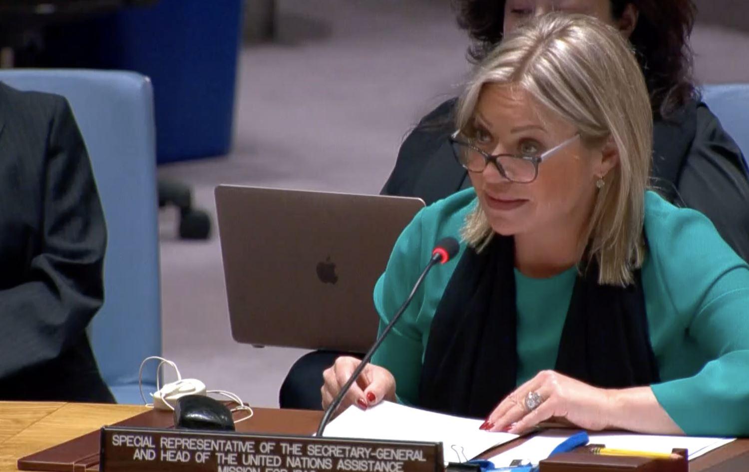جێنین پلاسخارت، نێردەی نەتەوە یەکگرتووەکان لە عێراق لە ئەنجوومەنی ئاسایشی نێودەوڵەتی قسە دەکات.