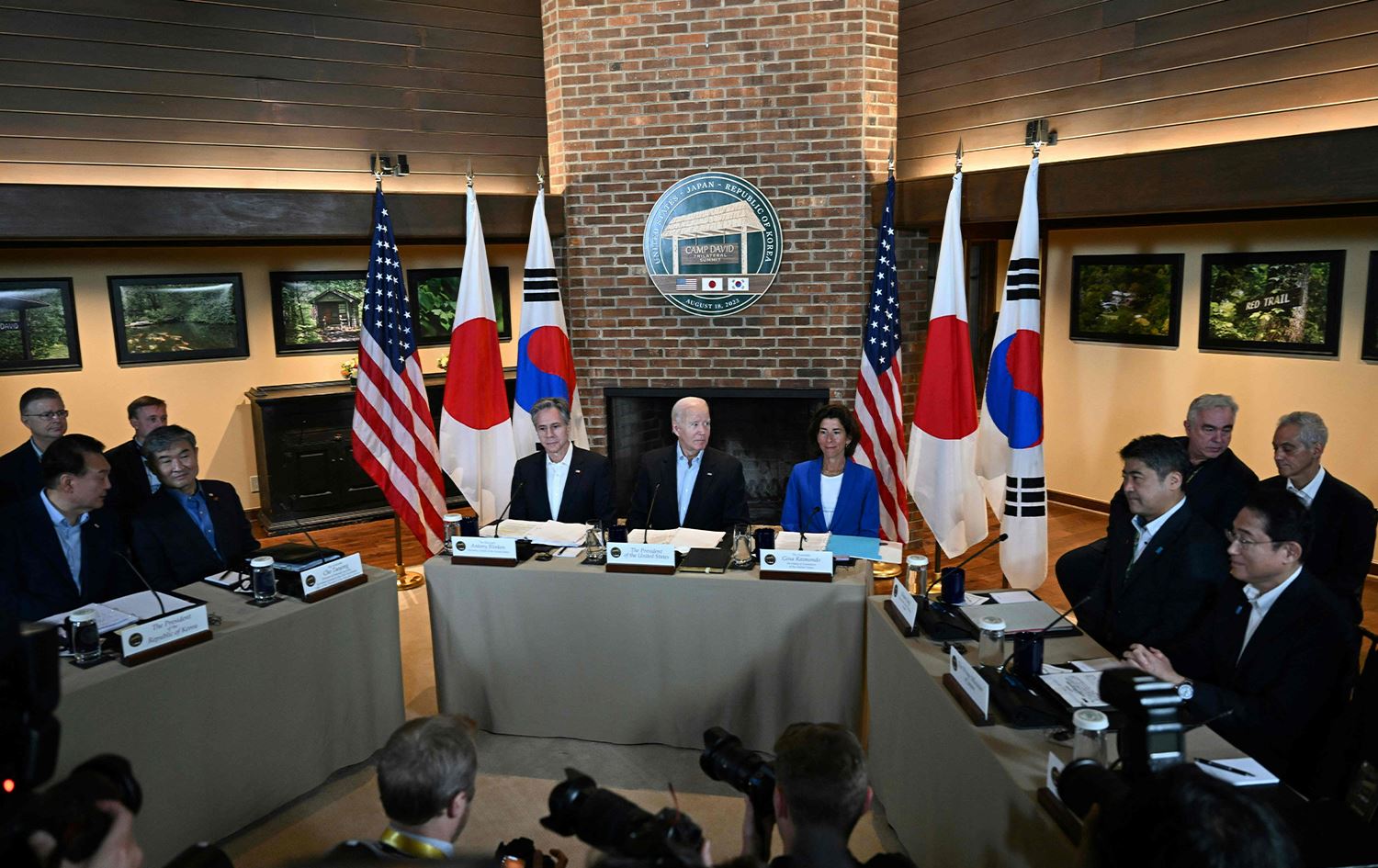 رۆژی هەینی، 18ـی ئابی 2023، جەیک سوڵیڤان، راوێژکاری ئاسایشی نیشتمانیی ئەمریکا گوتی، حکومەتی وڵاتەکەی لەگەڵ هەریەکە لە ژاپۆن و کۆریای باشوور چالاکیی هاوبەش و راوێژکردنیان بۆ رووبەڕووبوونەوەی قەیرانەکان دەبێت. ئاماژەی بەوەش کرد، "ئەمڕۆ سەرکردەکان پلانێکی چەند ساڵە دادەنێن بۆ چالاکیی هاوبەشی سەربازی لە هەموو بوارەکاندا".