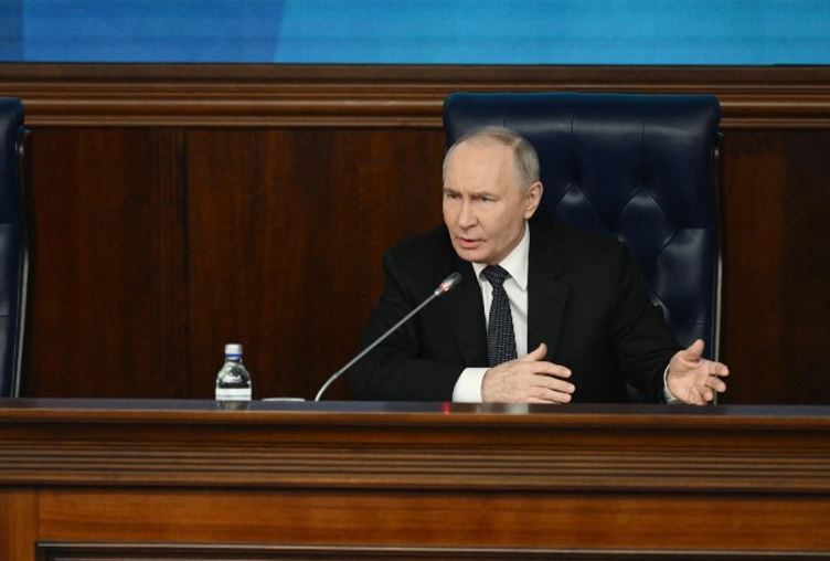 ڤلادیمیر پووتین، سەرۆکی رووسیا بەشداری لە کۆبوونەوەیەکی ئەنجوومەنی وەزارەتی بەرگریی وڵاتەکەی دەکات لە سەنتەری نیشتمانیی کۆنترۆڵکردنی بەرگری لە مۆسکۆ، 17-12-2025. وێنە: AFP