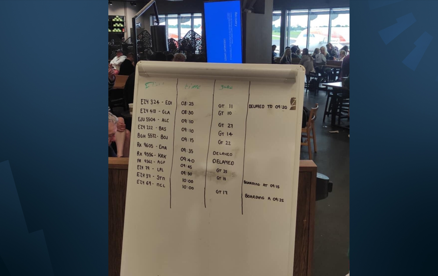 مارتن ماکئیلرۆی گەشتیارێکە لە فڕۆکەخانەی بێلفاست، وێنەیەکی گرتووە کە تێیدا دەردەکەوێت ئاکرانە ئەلیکترۆنییەکان لە فڕۆکەخانەکە کار ناکەن و تەختەی سپی بەکاردەهێندرێت بۆ نووسینی کات و زانیارییەکان لەبارەی گەشتەکان بۆ گەشتیاران.