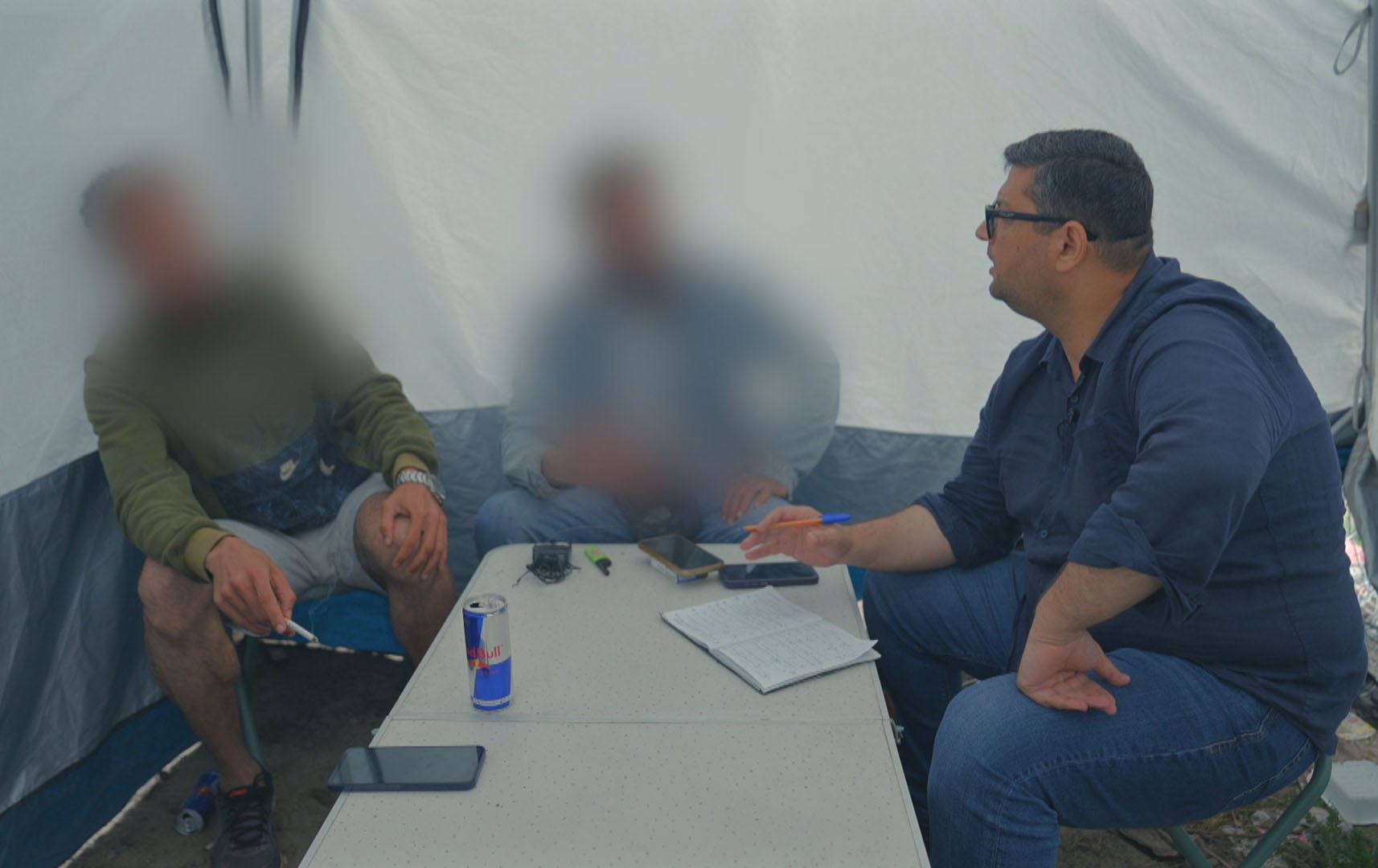 هیڤیدار ئەحمەد، پێشکێشکاری رووداو لە جەنگەڵەکانی فەرەنسا قسە لەگەڵ دوو قاچاخچیدا دەکات کە کۆچبەر دەگەیێننە بەریتانیا