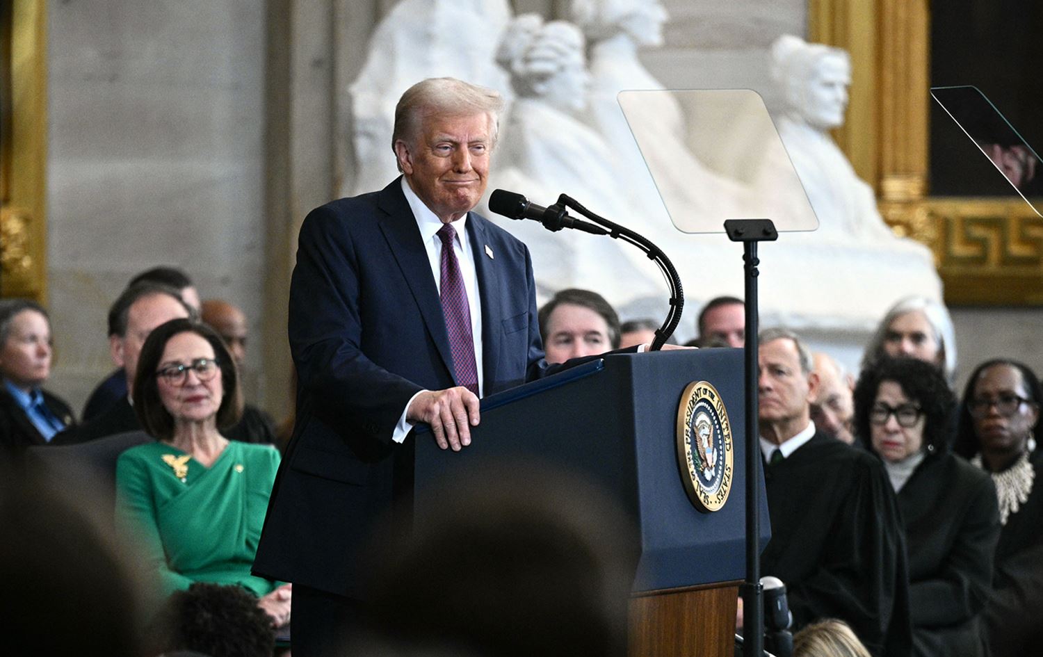 هەریەک لە جۆ بایدن، سەرۆکی پێشووی ئەمریکا و کامالا هاریسی جێگری لە پشتییەوە دانیشتبوون، ئەمە جگە لە ئامادەبوونی دەیان سەرۆکی پێشوو، بەرپرس و دەوڵەمەندی ناوداری ئەمریکا لە نێو هۆڵەکە.