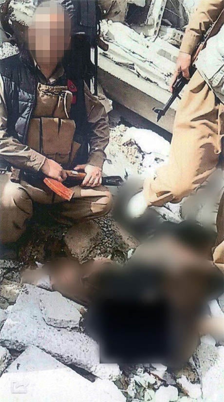 ئەو کەسە لە یەکێک لە وێنەکاندا بە چیچکانەوە وێنەی لەگەڵ لاشەی کوژراوێکی داعشدا گرتووە کە سەری لێکراوەتەوە و تەرمەکەیشی شێوێندراوە. بەڵام ئەو دەڵێت ئەوە فەرماندە سەربازییەکەیان بووە کە وێنەکەی گرتووە بۆ ئەوەی نیشانی ئەو وڵاتانەی بدات کە چەک دەدەن بە داعش و راهێنانیان پێ دەکەن.