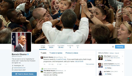 رۆژی 17 ی ئایاری 2015 ، باراک ئۆباما ئەژمارێکی تایبەت بە خۆی لە تویتەر کردەوە، لەیەکەم تویتیشیدا نووسی " های تویتەر، من بەڕاستی باراک ئۆبامام، کە دوای 6 ساڵ توانیم ئەژمارێکی تایبەت بە خۆم لە تویتەر بکەمەوە".