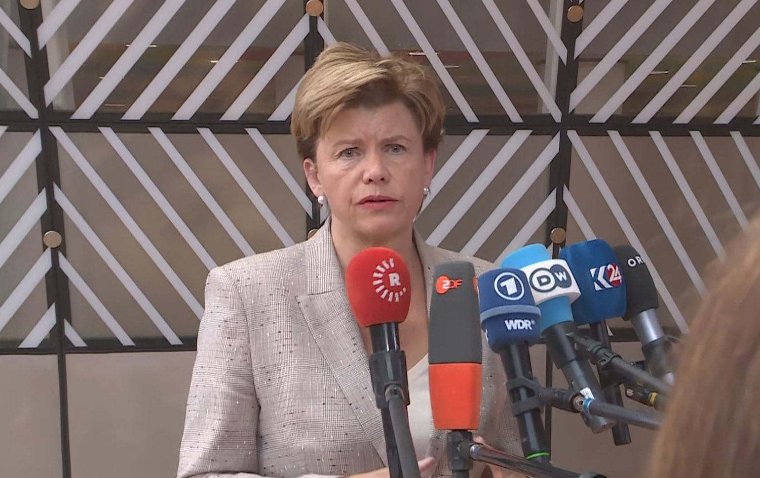 بایبا بڕازێ، وەزیری دەرەوەی لاتیڤیا وەڵامی پرسیارێکی ئاڵا شاڵی، نێردراوی رووداوی لە برۆکسل لەبارەی سووریا دایەوە.