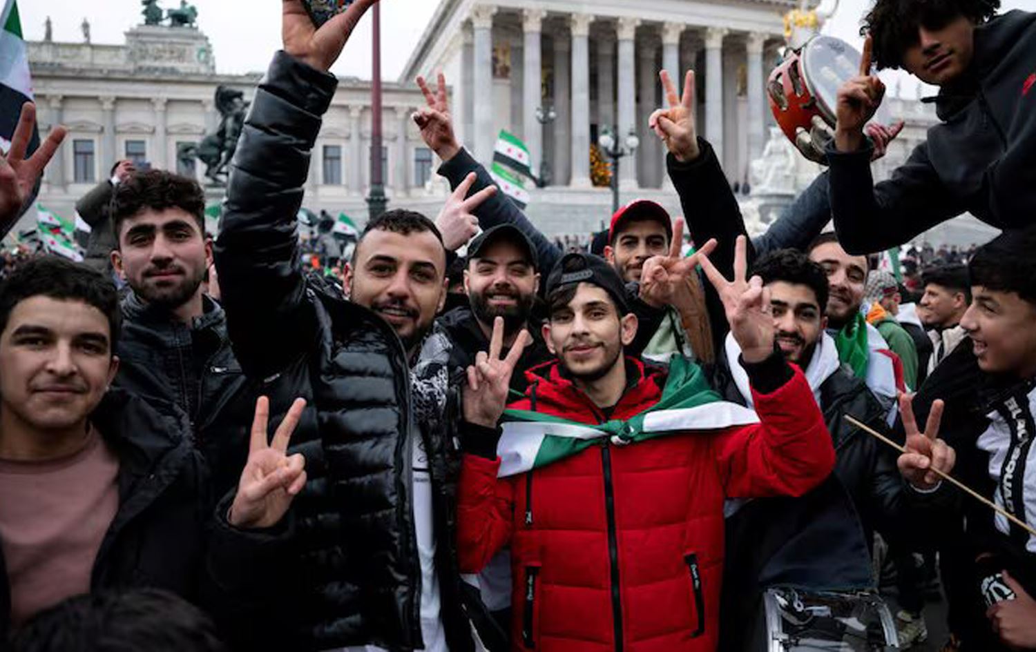 ژمارەیەک پەنابەری سووریایی لەبەردەم پەرلەمانی نەمسا بەبۆنەی رووخانی دەسەڵاتی بەشار ئەسەد، ئاهەنگدەگێڕن. وێنە: Elisabeth Mandl- Reuters