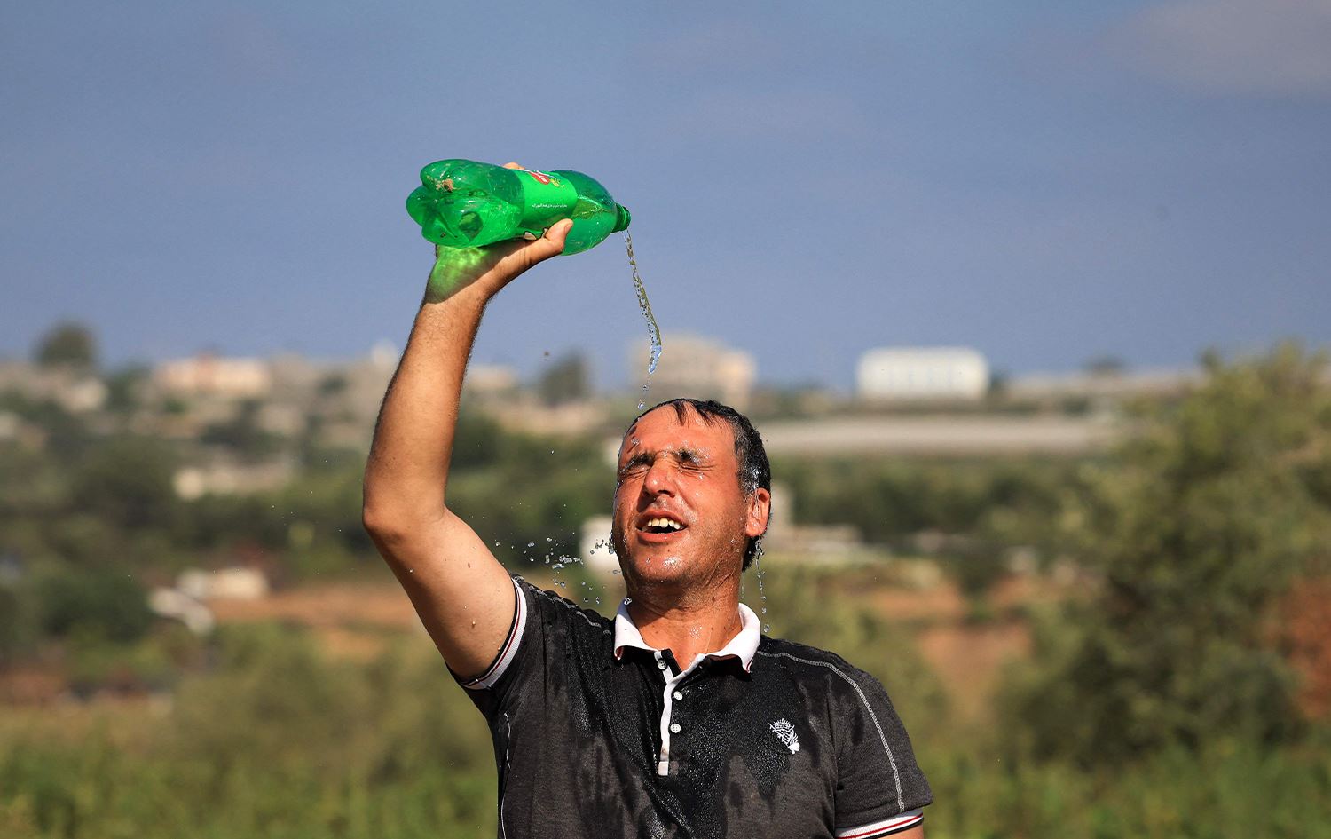 جووتیارێک لە شارۆچکەی بێت لاهییە لە غەززە لە تاو گەرما ئاو بەسەر سەری خۆیدا دادەکات. وێنە: AFP
