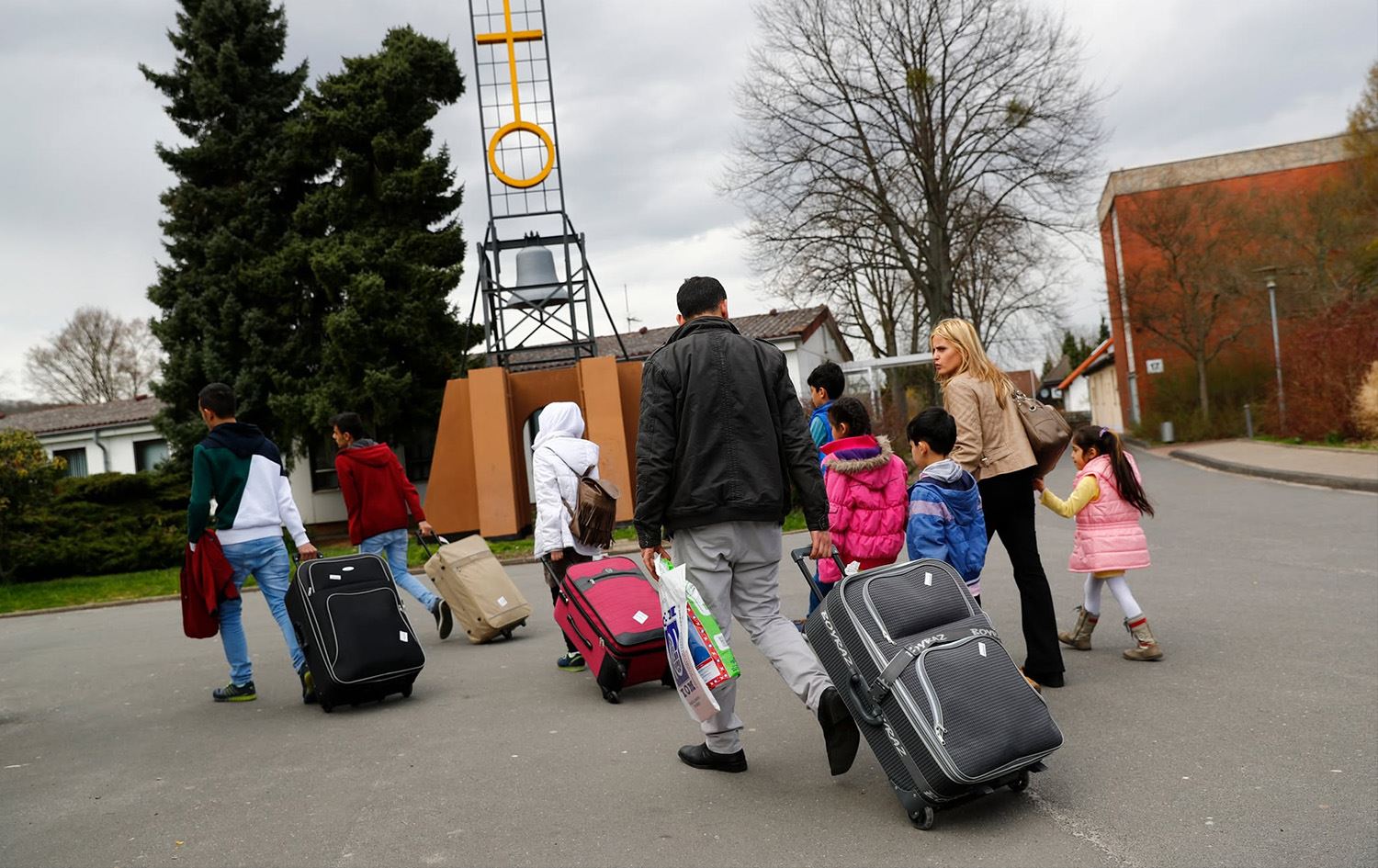 ژمارەیەک پەنابەری سووری لە 4ـی نیسانی 2016 دەگەنە کەمپێک لە فریدلاندی ئەڵمانیا. وێنەکە لەلایەن ئاژانسی رۆیتەرزەوە گیراوە.