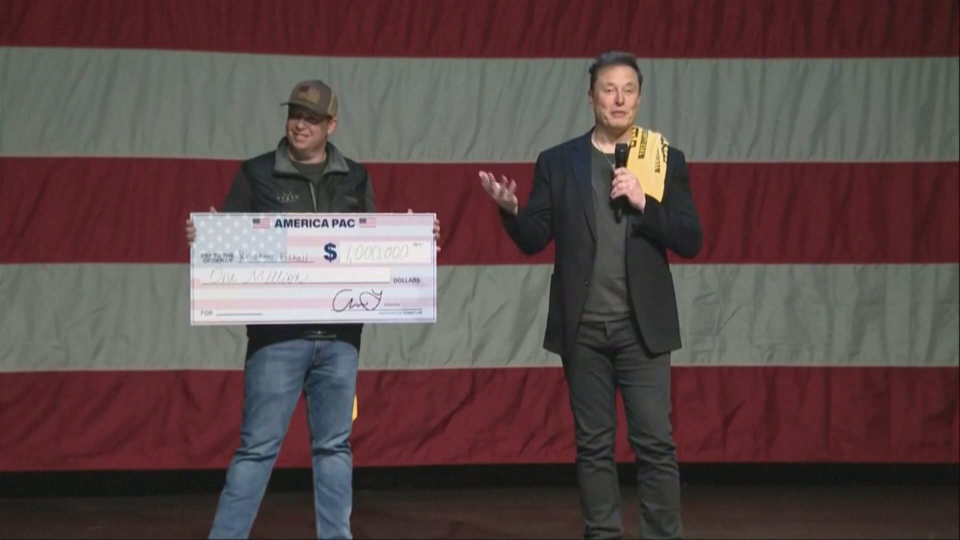 رۆژی یەکشەممە، لە ناوچەی مکیس لە ویلایەتی پێنسلڤانیا، مەسک کەسێکی لەنێو ئامادەبووان بانگکردە سەر سەکۆیەکە و پێی گوت، "تەنیا پێویستە واژۆ لەسەر ئەوە بکەیت کە بڕوات بە دەستوورە، واتە ئەگەر بڕوات بە دەستوور بێت، واژۆ لەسەر شتێک دەکەیت کە خۆت پێشتر بڕوات پێی هەبووە و دەتوانی یەک ملیۆن دۆلار ببەیتەوە".