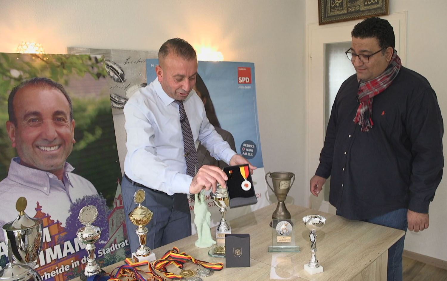 کەریم لەسەر ئەو مێزەی کاری لەسەر دەکات، هەموو میدالیا و جامەکانی نمایش کرد و گوتی، "ئەوانەی دەیبینیت، هەموویم بەدەستهێناوە، ژمارەیان لەوە زیاتریشە، بەڵام بەشێکم کردوون بە دیاری، ئەمەشیان میدالیای سەرۆکی ئەڵمانییە وەرمگرتووە؛ هەروەها ئەمەشیان بەشێک لەو رۆژنامە و گۆڤارانەن کە وێنە و هەواڵی بردنەوەکانی منیان بڵاوکردوونەتەوە". دەشڵێت، "کاتێکیش گەورە و بەڕێوەبەری کەمپی کۆچبەرانی ئۆکراینا بووم، هاوکاریمان دەکردن و سەرۆکوەزیرانی هەرێمەکەمان دوو جار بەو هۆیەوە خەڵاتی کردووم و ئەوەش خەڵاتەکانمە."