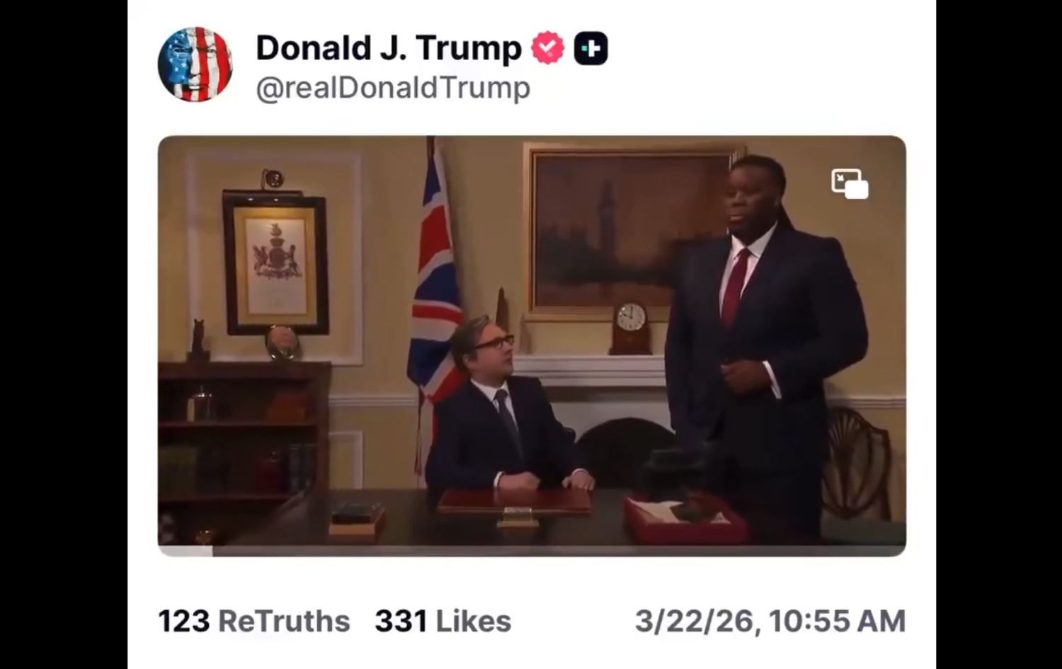 ڤیدیۆکە دیمەنێکی وەرگیراوی بەرنامەی (ساتردەی نایت لایڤ)ـی وەشانی بەریتانییە. تێیدا ئەکتەری رۆڵی ستامەر لە ناو بارەگای سەرۆکوەزیران لە (داونینگ ستریت) بە دۆخێکی پڕ لە ترس و دڵەڕاوکێوە دەردەکەوێت تەنیا لەبەر ئەگەری کردنی پەیوەندییەکی تەلەفۆنی لەگەڵ ترەمپ.