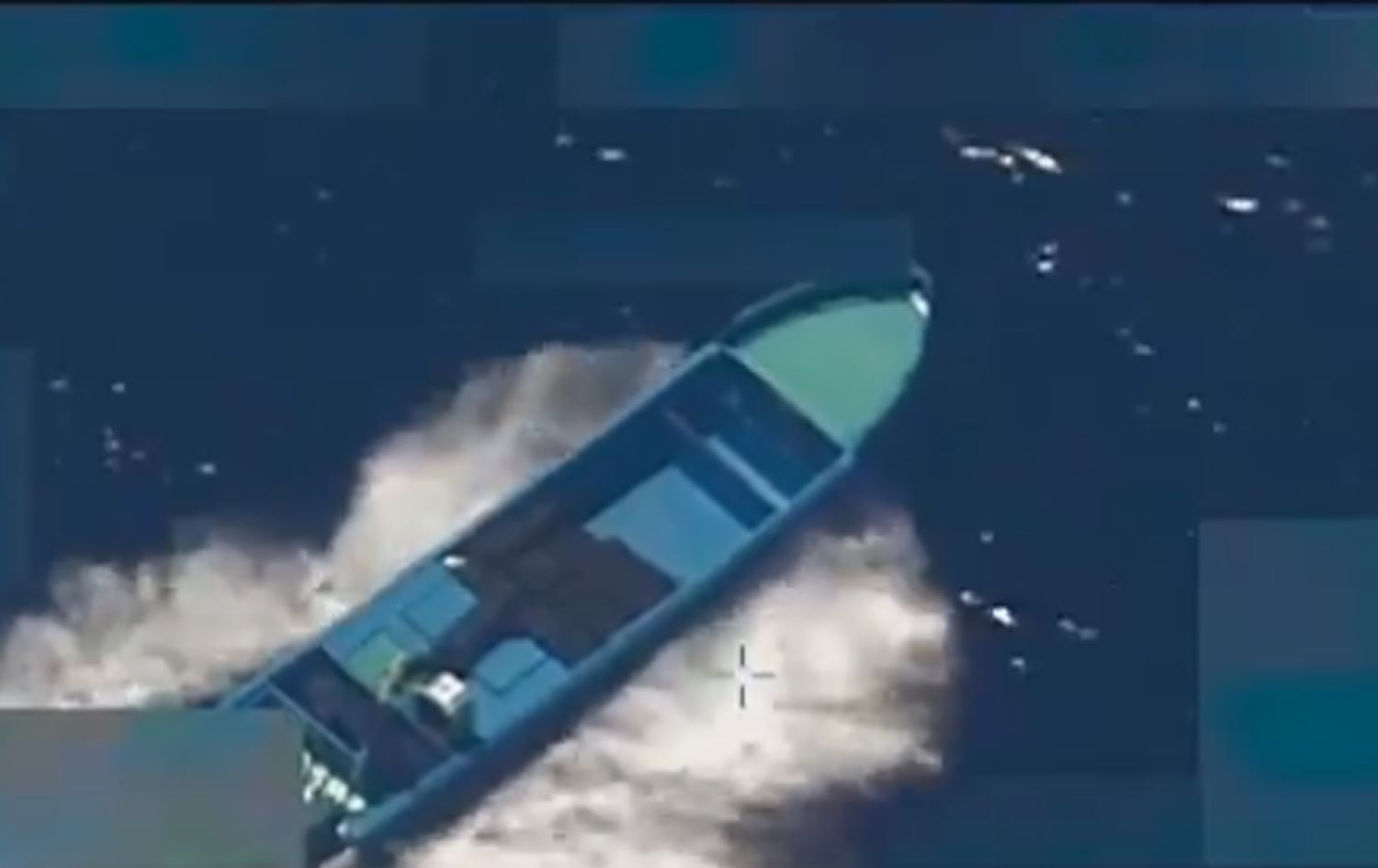 ئەو بەلەمەی هێرشی کراوەتە سەر. وێنەکە لە ڤیدیۆیەک وەرگیراوە کە وەزیری بەرگریی ئەمریکا بڵاویکردووەتەوە.